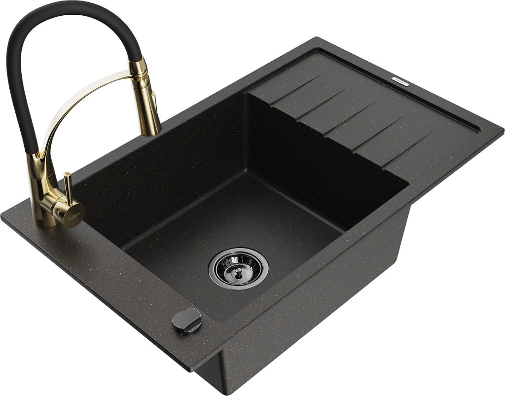 Technické dáta: drez: Rozmer: 795 x 480 x 200 mm Hĺbka komory: 190 mm Rozmery komory: 465x420 mm Priemer odtoku: ø90 mm Typ: 1-miska s krátkym odkvapkávačom Typ: Zapustené do pracovnej dosky Farba: čierna / zlatá metalíza Povrchová úprava sifónu: čierna Materiál: žula (80% žulové kamenivo, 20% živice) Prepadový otvor: Áno Otvory: (batérie, automatické) 2 Inštalácia: Univerzálna, je možné inštalovať s odkvapkávačom na ľavú alebo pravú stranu Vysoká odolnosť proti poškriabaniu a zmene farby Odolnosť proti tepelným šokom Ľahko čistiteľný povrch Jeden dodatočný vyfrézovaný otvor na samodierovanie ø35 kuchynská batéria: Materiál: mosadz Farba: Zlatá/Čierna Hlava: Keramická Prevzdušňovač: Áno Typ: Jedna páka Výška batérie: 430 mm Rozsah výtoku: 185 mm Batéria má výsuvný výtok(GT) Ean: 5905315046154