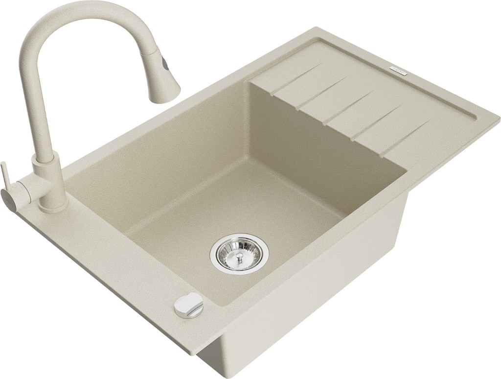 Technické dáta: drez: Rozmer: 795 x 480 x 200 mm Hĺbka komory: 190 mm Rozmery komory: 465x420 mm Priemer odtoku: ø90 mm Typ: 1-miska s krátkym odkvapkávačom Typ: Zapustené do pracovnej dosky Farba béžová Povrchová úprava sifónu: Chrome Materiál: žula (80% žulové kamenivo, 20% živice) Prepadový otvor: Áno Otvory: (batérie, automatické) 2 Inštalácia: Univerzálna, je možné inštalovať s odkvapkávačom na ľavú alebo pravú stranu Vysoká odolnosť proti poškriabaniu a zmene farby Odolnosť proti tepelným šokom Ľahko čistiteľný povrch Jeden dodatočný vyfrézovaný otvor na samodierovanie ø35 kuchynská batéria: Materiál: mosadz Farba béžová Hlava: Keramická Prevzdušňovač: Áno Typ: Jedna páka Výška batérie: 380 mm Rozsah výtoku: 252 mm Typ výtoku: Výsuvný(GT) Ean: 5905315029744