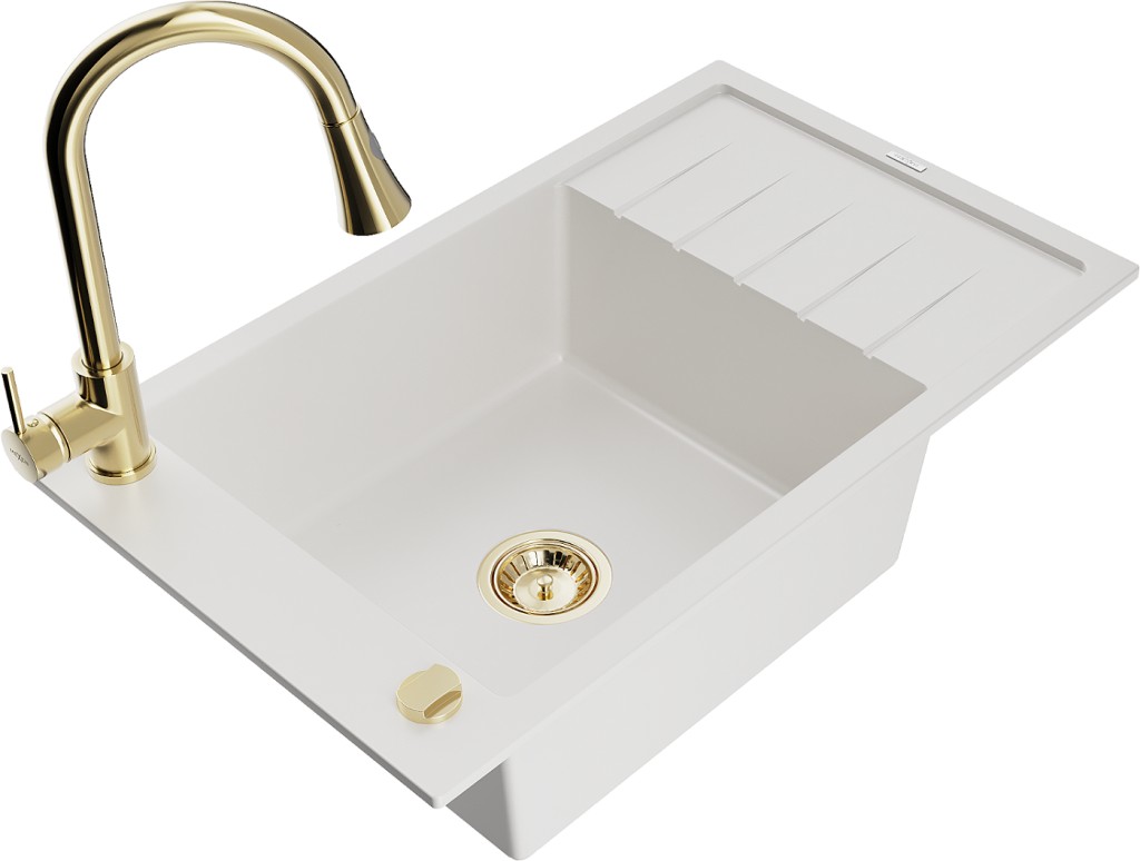 Technické dáta: drez: Rozmer: 795 x 480 x 200 mm Hĺbka komory: 190 mm Rozmery komory: 465x420 mm Priemer odtoku: ø90 mm Typ: 1-miska s krátkym odkvapkávačom Typ: Zapustené do pracovnej dosky biela farba Povrchová úprava sifónu: zlatá Materiál: žula (80% žulové kamenivo, 20% živice) Prepadový otvor: Áno Otvory: (batérie, automatické) 2 Inštalácia: Univerzálna, je možné inštalovať s odkvapkávačom na ľavú alebo pravú stranu Vysoká odolnosť proti poškriabaniu a zmene farby Odolnosť proti tepelným šokom Ľahko čistiteľný povrch Jeden dodatočný vyfrézovaný otvor na samodierovanie ø35 kuchynská batéria: Materiál: mosadz Farba: Zlatá Hlava: Keramická Prevzdušňovač: Áno Typ: Jedna páka Výška batérie: 380 mm Rozsah výtoku: 252 mm Typ výtoku: Výsuvný(GT) Ean: 5905315029713