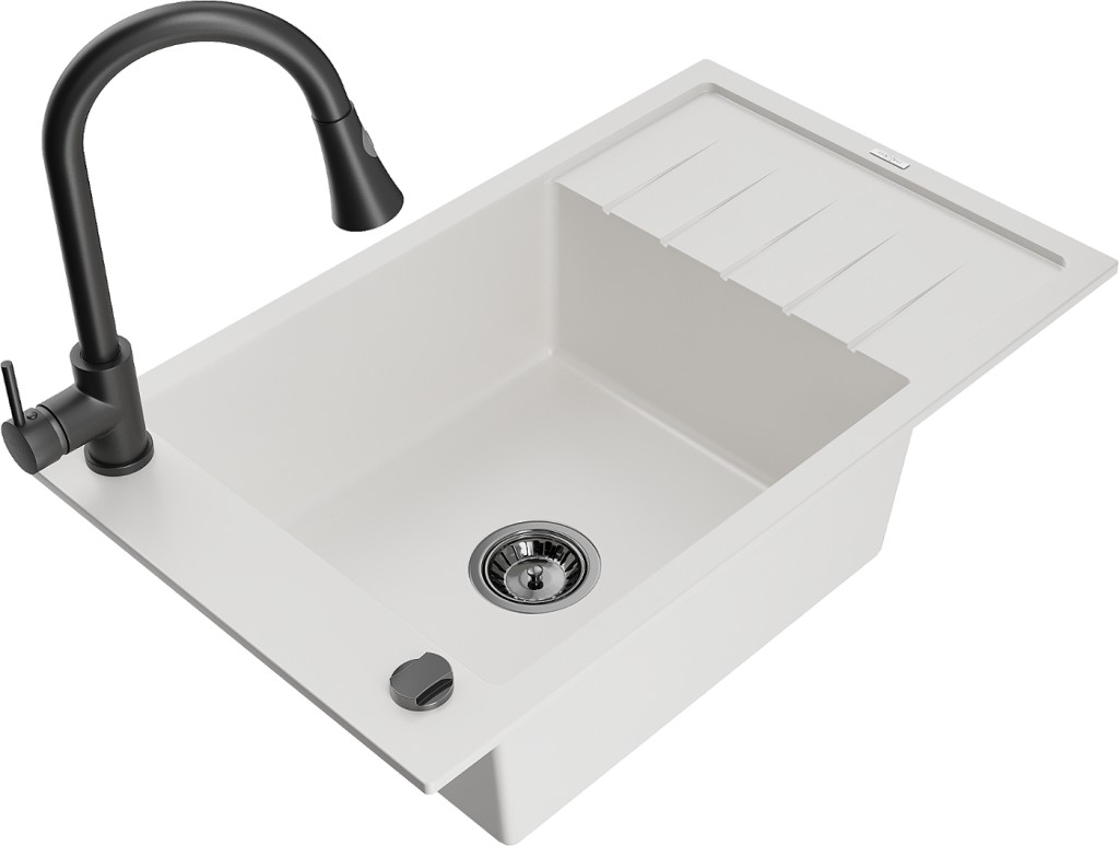 Technické dáta: drez: Rozmer: 795 x 480 x 200 mm Hĺbka komory: 190 mm Rozmery komory: 465x420 mm Priemer odtoku: ø90 mm Typ: 1-miska s krátkym odkvapkávačom Typ: Zapustené do pracovnej dosky biela farba Povrchová úprava sifónu: čierna Materiál: žula (80% žulové kamenivo, 20% živice) Prepadový otvor: Áno Otvory: (batérie, automatické) 2 Inštalácia: Univerzálna, je možné inštalovať s odkvapkávačom na ľavú alebo pravú stranu Vysoká odolnosť proti poškriabaniu a zmene farby Odolnosť proti tepelným šokom Ľahko čistiteľný povrch Jeden dodatočný vyfrézovaný otvor na samodierovanie ø35 kuchynská batéria: Materiál: mosadz Čierna farba Hlava: Keramická Prevzdušňovač: Áno Typ: Jedna páka Výška batérie: 380 mm Rozsah výtoku: 252 mm Typ výtoku: Výsuvný(GT) Ean: 5905315029720