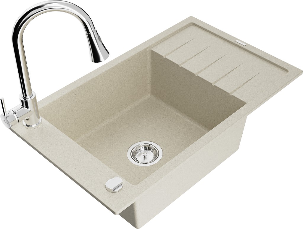 Technické dáta: drez: Rozmer: 795 x 480 x 200 mm Hĺbka komory: 190 mm Rozmery komory: 465x420 mm Priemer odtoku: ø90 mm Typ: 1-miska s krátkym odkvapkávačom Typ: Zapustené do pracovnej dosky Farba béžová Povrchová úprava sifónu: Chrome Materiál: žula (80% žulové kamenivo, 20% živice) Prepadový otvor: Áno Otvory: (batérie, automatické) 2 Inštalácia: Univerzálna, je možné inštalovať s odkvapkávačom na ľavú alebo pravú stranu Vysoká odolnosť proti poškriabaniu a zmene farby Odolnosť proti tepelným šokom Ľahko čistiteľný povrch Jeden dodatočný vyfrézovaný otvor na samodierovanie ø35 kuchynská batéria: Materiál: mosadz Farba: Chrome Hlava: Keramická Prevzdušňovač: Áno Typ: Jedna páka Výška batérie: 380 mm Rozsah výtoku: 252 mm Typ výtoku: Výsuvný(GT) Ean: 5905315029737