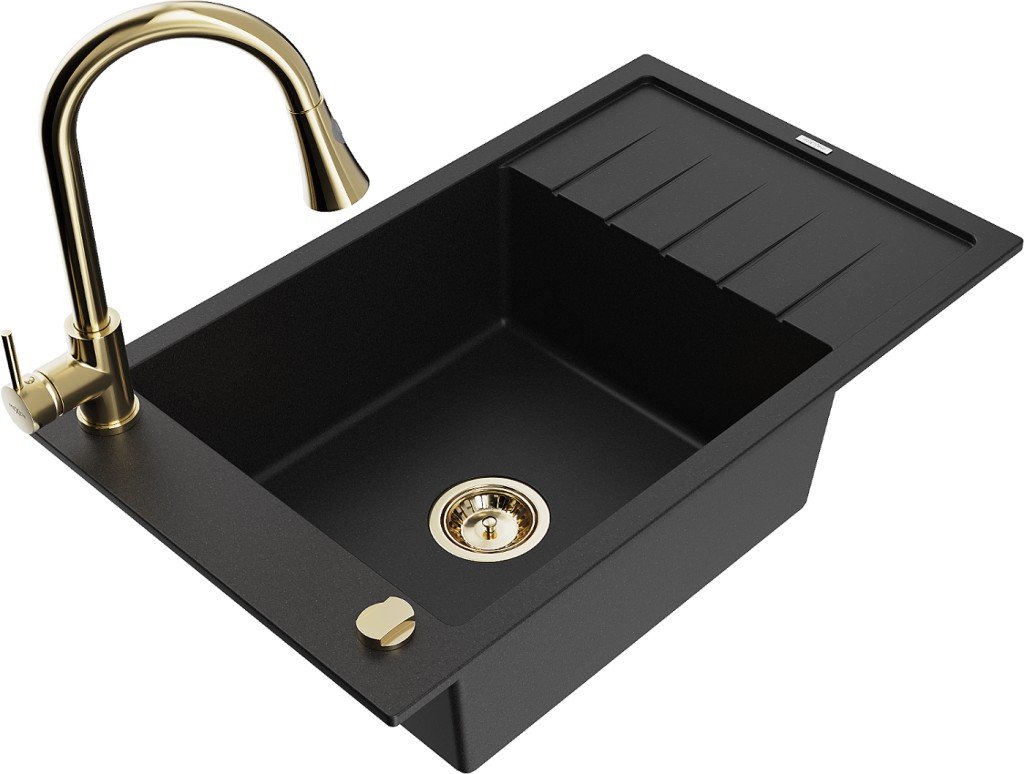 Technické dáta: drez: Rozmer: 795 x 480 x 200 mm Hĺbka komory: 190 mm Rozmery komory: 465x420 mm Priemer odtoku: ø90 mm Typ: 1-miska s krátkym odkvapkávačom Typ: Zapustené do pracovnej dosky Čierna farba Povrchová úprava sifónu: zlatá Materiál: žula (80% žulové kamenivo, 20% živice) Prepadový otvor: Áno Otvory: (batérie, automatické) 2 Inštalácia: Univerzálna, je možné inštalovať s odkvapkávačom na ľavú alebo pravú stranu Vysoká odolnosť proti poškriabaniu a zmene farby Odolnosť proti tepelným šokom Ľahko čistiteľný povrch Jeden dodatočný vyfrézovaný otvor na samodierovanie ø35 kuchynská batéria: Materiál: mosadz Farba: Zlatá Hlava: Keramická Prevzdušňovač: Áno Typ: Jedna páka Výška batérie: 380 mm Rozsah výtoku: 252 mm Typ výtoku: Výsuvný(GT) Ean: 5905315029973