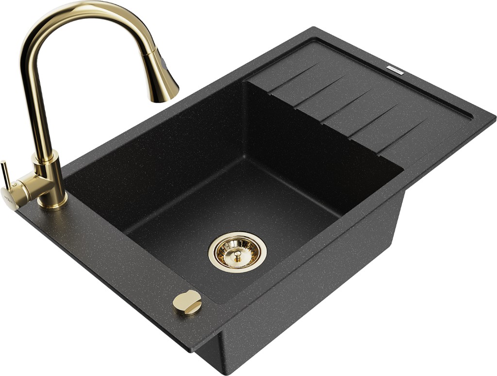 Technické dáta: drez: Rozmer: 795 x 480 x 200 mm Hĺbka komory: 190 mm Rozmery komory: 465x420 mm Priemer odtoku: ø90 mm Typ: 1-miska s krátkym odkvapkávačom Typ: Zapustené do pracovnej dosky Farba: čierna/strieborná metalíza Povrchová úprava sifónu: zlatá Materiál: žula (80% žulové kamenivo, 20% živice) Prepadový otvor: Áno Otvory: (batérie, automatické) 2 Inštalácia: Univerzálna, je možné inštalovať s odkvapkávačom na ľavú alebo pravú stranu Vysoká odolnosť proti poškriabaniu a zmene farby Odolnosť proti tepelným šokom Ľahko čistiteľný povrch Jeden dodatočný vyfrézovaný otvor na samodierovanie ø35 kuchynská batéria: Materiál: mosadz Farba: Zlatá Hlava: Keramická Prevzdušňovač: Áno Typ: Jedna páka Výška batérie: 380 mm Rozsah výtoku: 252 mm Typ výtoku: Výsuvný(GT) Ean: 5905315029836