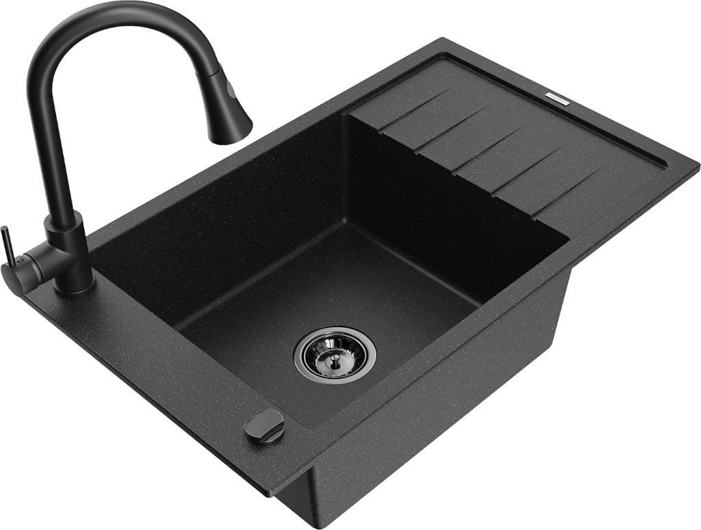 Technické dáta: drez: Rozmer: 795 x 480 x 200 mm Hĺbka komory: 190 mm Rozmery komory: 465x420 mm Priemer odtoku: ø90 mm Typ: 1-miska s krátkym odkvapkávačom Typ: Zapustené do pracovnej dosky Farba: čierna/strieborná metalíza Povrchová úprava sifónu: čierna Materiál: žula (80% žulové kamenivo, 20% živice) Prepadový otvor: Áno Otvory: (batérie, automatické) 2 Inštalácia: Univerzálna, je možné inštalovať s odkvapkávačom na ľavú alebo pravú stranu Vysoká odolnosť proti poškriabaniu a zmene farby Odolnosť proti tepelným šokom Ľahko čistiteľný povrch Jeden dodatočný vyfrézovaný otvor na samodierovanie ø35 kuchynská batéria: Materiál: mosadz Čierna farba Hlava: Keramická Prevzdušňovač: Áno Typ: Jedna páka Výška batérie: 380 mm Rozsah výtoku: 252 mm Typ výtoku: Výsuvný(GT) Ean: 5905315029843