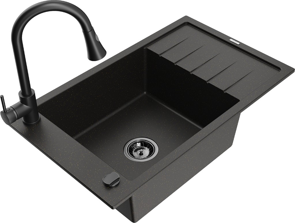 Technické dáta: drez: Rozmer: 795 x 480 x 200 mm Hĺbka komory: 190 mm Rozmery komory: 465x420 mm Priemer odtoku: ø90 mm Typ: 1-miska s krátkym odkvapkávačom Typ: Zapustené do pracovnej dosky Farba: čierna / zlatá metalíza Povrchová úprava sifónu: čierna Materiál: žula (80% žulové kamenivo, 20% živice) Prepadový otvor: Áno Otvory: (batérie, automatické) 2 Inštalácia: Univerzálna, je možné inštalovať s odkvapkávačom na ľavú alebo pravú stranu Vysoká odolnosť proti poškriabaniu a zmene farby Odolnosť proti tepelným šokom Ľahko čistiteľný povrch Jeden dodatočný vyfrézovaný otvor na samodierovanie ø35 kuchynská batéria: Materiál: mosadz Čierna farba Hlava: Keramická Prevzdušňovač: Áno Typ: Jedna páka Výška batérie: 380 mm Rozsah výtoku: 252 mm Typ výtoku: Výsuvný(GT) Ean: 5905315029898