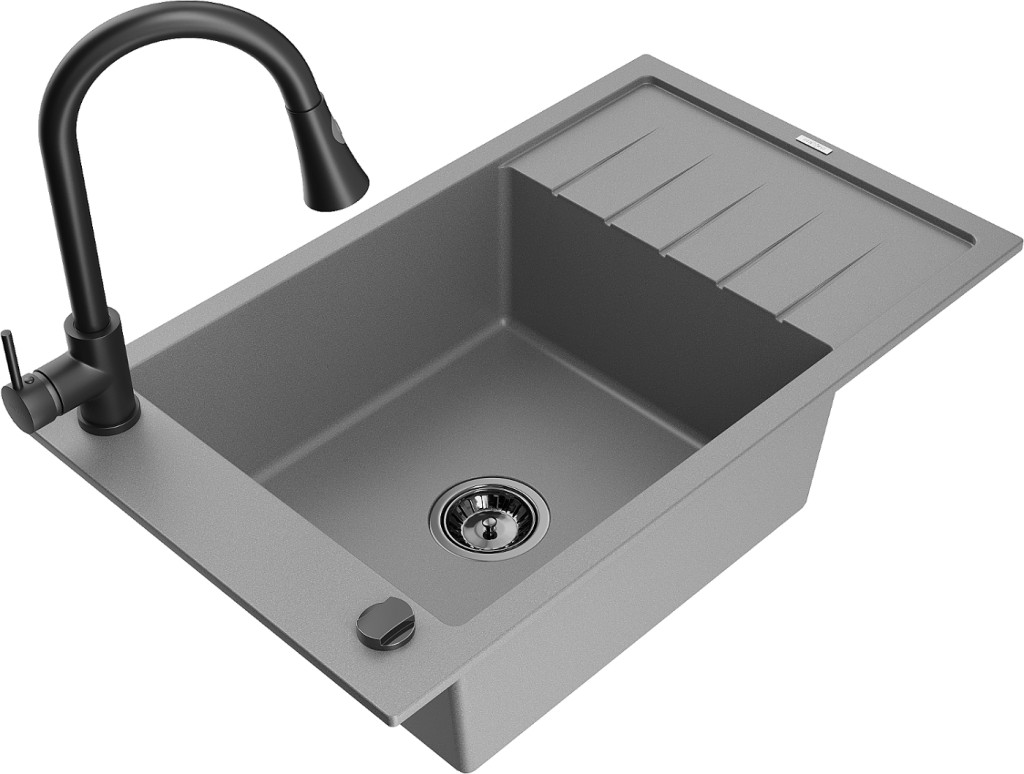 Technické dáta: drez: Rozmer: 795 x 480 x 200 mm Hĺbka komory: 190 mm Rozmery komory: 465x420 mm Priemer odtoku: ø90 mm Typ: 1-miska s krátkym odkvapkávačom Typ: Zapustené do pracovnej dosky Šedá farba Povrchová úprava sifónu: čierna Materiál: žula (80% žulové kamenivo, 20% živice) Prepadový otvor: Áno Otvory: (batérie, automatické) 2 Inštalácia: Univerzálna, je možné inštalovať s odkvapkávačom na ľavú alebo pravú stranu Vysoká odolnosť proti poškriabaniu a zmene farby Odolnosť proti tepelným šokom Ľahko čistiteľný povrch Jeden dodatočný vyfrézovaný otvor na samodierovanie ø35 kuchynská batéria: Materiál: mosadz Čierna farba Hlava: Keramická Prevzdušňovač: Áno Typ: Jedna páka Výška batérie: 380 mm Rozsah výtoku: 252 mm Typ výtoku: Výsuvný(GT) Ean: 5905315029805
