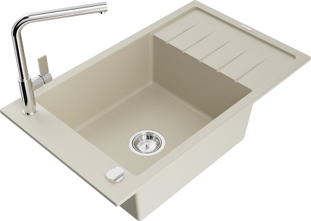 Technické dáta: drez: Rozmer: 795 x 480 x 200 mm Hĺbka komory: 190 mm Rozmery komory: 465x420 mm Priemer odtoku: ø90 mm Typ: 1-miska s krátkym odkvapkávačom Typ: Zapustené do pracovnej dosky Farba béžová Povrchová úprava sifónu: Chrome Materiál: žula (80% žulové kamenivo, 20% živice) Prepadový otvor: Áno Otvory: (batérie, automatické) 2 Inštalácia: Univerzálna, je možné inštalovať s odkvapkávačom na ľavú alebo pravú stranu Vysoká odolnosť proti poškriabaniu a zmene farby Odolnosť proti tepelným šokom Ľahko čistiteľný povrch Jeden dodatočný vyfrézovaný otvor na samodierovanie ø35 kuchynská batéria: Materiál: mosadz Farba: Chrome Hlava: Keramická Prevzdušňovač: Áno Typ: Jedna páka Rozsah výtoku: 245 mm Výška batérie: 307 mm(GT) Ean: 5905315060037