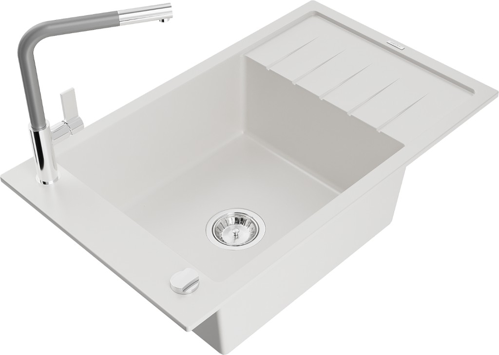 Technické dáta: drez: Rozmer: 795 x 480 x 200 mm Hĺbka komory: 190 mm Rozmery komory: 465x420 mm Priemer odtoku: ø90 mm Typ: 1-miska s krátkym odkvapkávačom Typ: Zapustené do pracovnej dosky biela farba Povrchová úprava sifónu: Chrome Materiál: žula (80% žulové kamenivo, 20% živice) Prepadový otvor: Áno Otvory: (batérie, automatické) 2 Inštalácia: Univerzálna, je možné inštalovať s odkvapkávačom na ľavú alebo pravú stranu Vysoká odolnosť proti poškriabaniu a zmene farby Odolnosť proti tepelným šokom Ľahko čistiteľný povrch Jeden dodatočný vyfrézovaný otvor na samodierovanie ø35 kuchynská batéria: Materiál: mosadz Farba: chróm/sivá Hlava: Keramická Prevzdušňovač: Áno Typ: Jedna páka Rozsah výtoku: 245 mm Výška batérie: 307 mm(GT) Ean: 5905315059970
