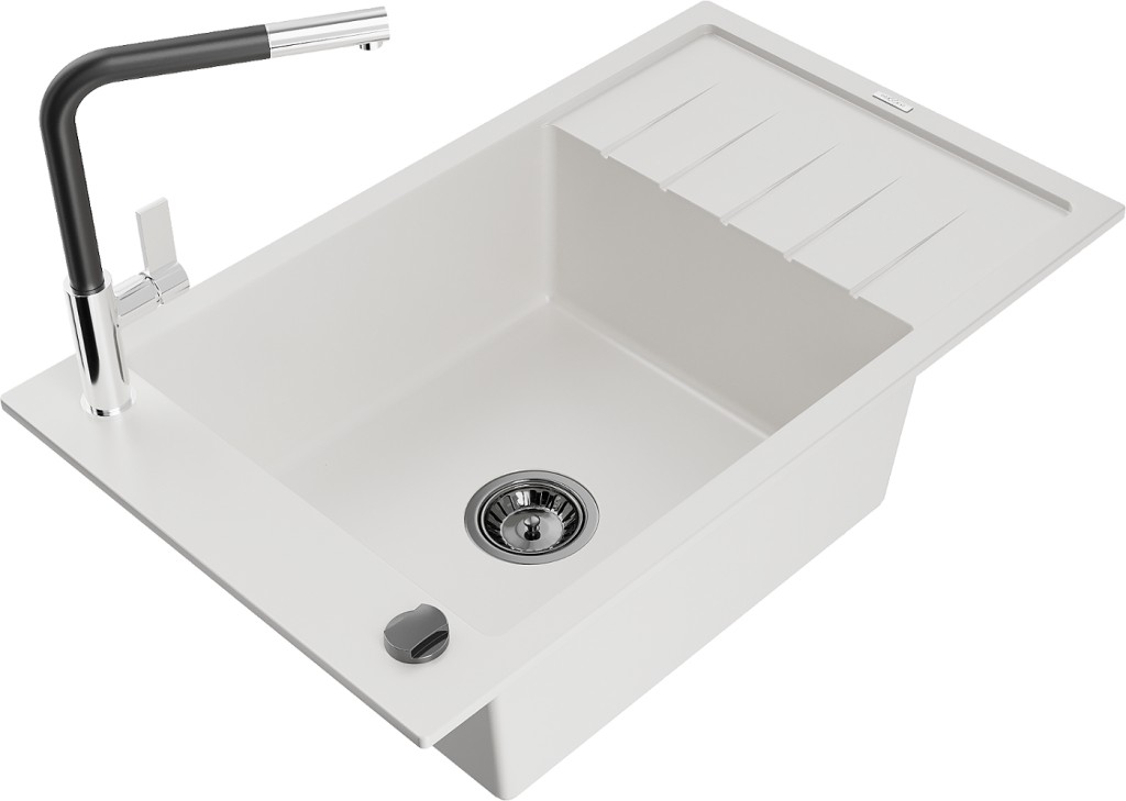 Technické dáta: drez: Rozmer: 795 x 480 x 200 mm Hĺbka komory: 190 mm Rozmery komory: 465x420 mm Priemer odtoku: ø90 mm Typ: 1-miska s krátkym odkvapkávačom Typ: Zapustené do pracovnej dosky biela farba Povrchová úprava sifónu: čierna Materiál: žula (80% žulové kamenivo, 20% živice) Prepadový otvor: Áno Otvory: (batérie, automatické) 2 Inštalácia: Univerzálna, je možné inštalovať s odkvapkávačom na ľavú alebo pravú stranu Vysoká odolnosť proti poškriabaniu a zmene farby Odolnosť proti tepelným šokom Ľahko čistiteľný povrch Jeden dodatočný vyfrézovaný otvor na samodierovanie ø35 kuchynská batéria: Materiál: mosadz Farba: chróm/čierna Hlava: Keramická Prevzdušňovač: Áno Typ: Jedna páka Rozsah výtoku: 245 mm Výška batérie: 307 mm(GT) Ean: 5905315059994