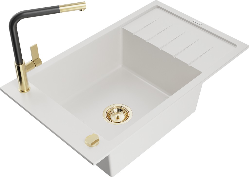 Technické dáta: drez: Rozmer: 795 x 480 x 200 mm Hĺbka komory: 190 mm Rozmery komory: 465x420 mm Priemer odtoku: ø90 mm Typ: 1-miska s krátkym odkvapkávačom Typ: Zapustené do pracovnej dosky biela farba Povrchová úprava sifónu: zlatá Materiál: žula (80% žulové kamenivo, 20% živice) Prepadový otvor: Áno Otvory: (batérie, automatické) 2 Inštalácia: Univerzálna, je možné inštalovať s odkvapkávačom na ľavú alebo pravú stranu Vysoká odolnosť proti poškriabaniu a zmene farby Odolnosť proti tepelným šokom Ľahko čistiteľný povrch Jeden dodatočný vyfrézovaný otvor na samodierovanie ø35 kuchynská batéria: Materiál: mosadz Farba: Zlatá/Čierna Hlava: Keramická Prevzdušňovač: Áno Typ: Jedna páka Rozsah výtoku: 245 mm Výška batérie: 307 mm(GT) Ean: 5905315060006