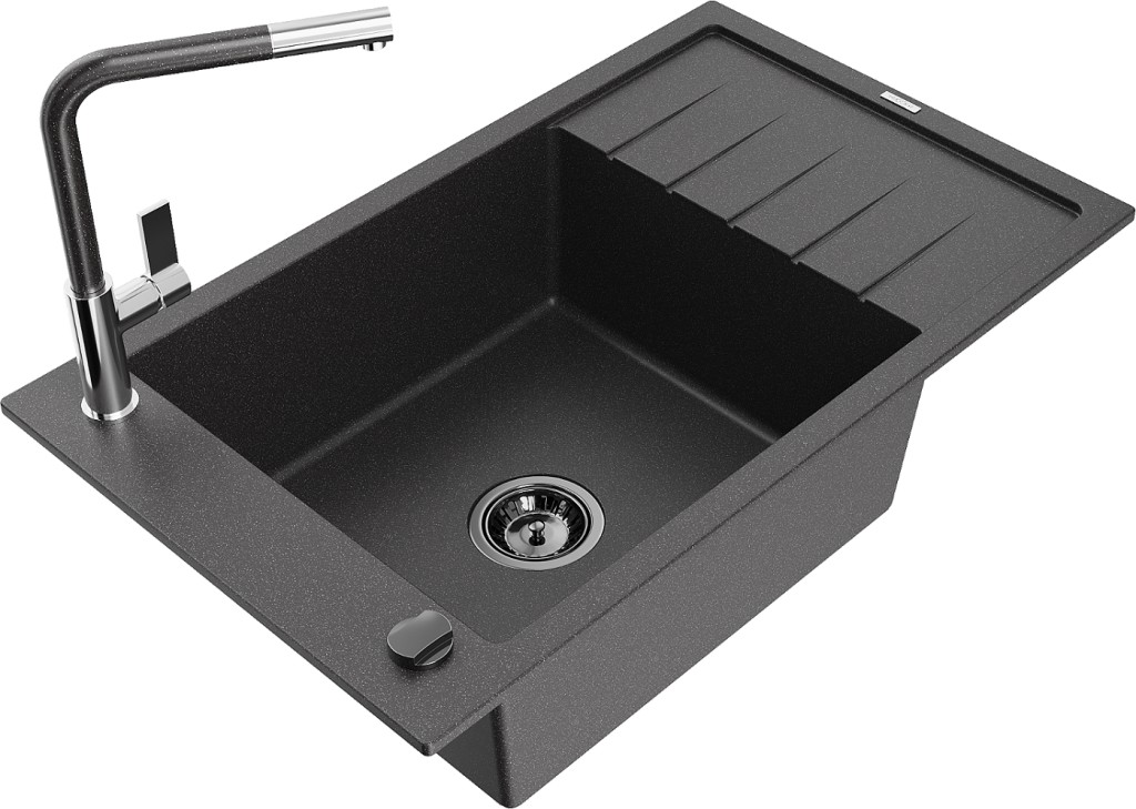 Technické dáta: drez: Rozmer: 795 x 480 x 200 mm Hĺbka komory: 190 mm Rozmery komory: 465x420 mm Priemer odtoku: ø90 mm Typ: 1-miska s krátkym odkvapkávačom Typ: Zapustené do pracovnej dosky Farba: Škvrnitá čierna Povrchová úprava sifónu: čierna Materiál: žula (80% žulové kamenivo, 20% živice) Prepadový otvor: Áno Otvory: (batérie, automatické) 2 Inštalácia: Univerzálna, je možné inštalovať s odkvapkávačom na ľavú alebo pravú stranu Vysoká odolnosť proti poškriabaniu a zmene farby Odolnosť proti tepelným šokom Ľahko čistiteľný povrch Jeden dodatočný vyfrézovaný otvor na samodierovanie ø35 kuchynská batéria: Materiál: mosadz Farba: chróm/čierna škvrnitá Hlava: Keramická Prevzdušňovač: Áno Typ: Jedna páka Rozsah výtoku: 245 mm Výška batérie: 307 mm(GT) Ean: 5905315060334