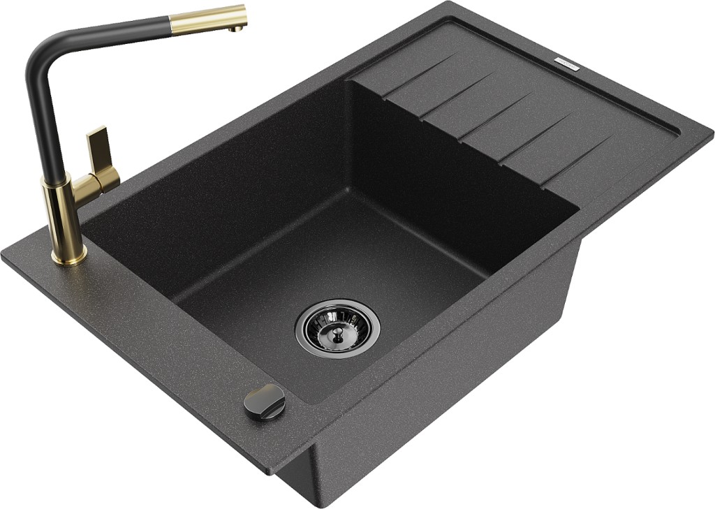 Technické dáta: drez: Rozmer: 795 x 480 x 200 mm Hĺbka komory: 190 mm Rozmery komory: 465x420 mm Priemer odtoku: ø90 mm Typ: 1-miska s krátkym odkvapkávačom Typ: Zapustené do pracovnej dosky Farba: Škvrnitá čierna Povrchová úprava sifónu: čierna Materiál: žula (80% žulové kamenivo, 20% živice) Prepadový otvor: Áno Otvory: (batérie, automatické) 2 Inštalácia: Univerzálna, je možné inštalovať s odkvapkávačom na ľavú alebo pravú stranu Vysoká odolnosť proti poškriabaniu a zmene farby Odolnosť proti tepelným šokom Ľahko čistiteľný povrch Jeden dodatočný vyfrézovaný otvor na samodierovanie ø35 kuchynská batéria: Materiál: mosadz Farba: Zlatá/Čierna Hlava: Keramická Prevzdušňovač: Áno Typ: Jedna páka Rozsah výtoku: 245 mm Výška batérie: 307 mm(GT) Ean: 5905315060358