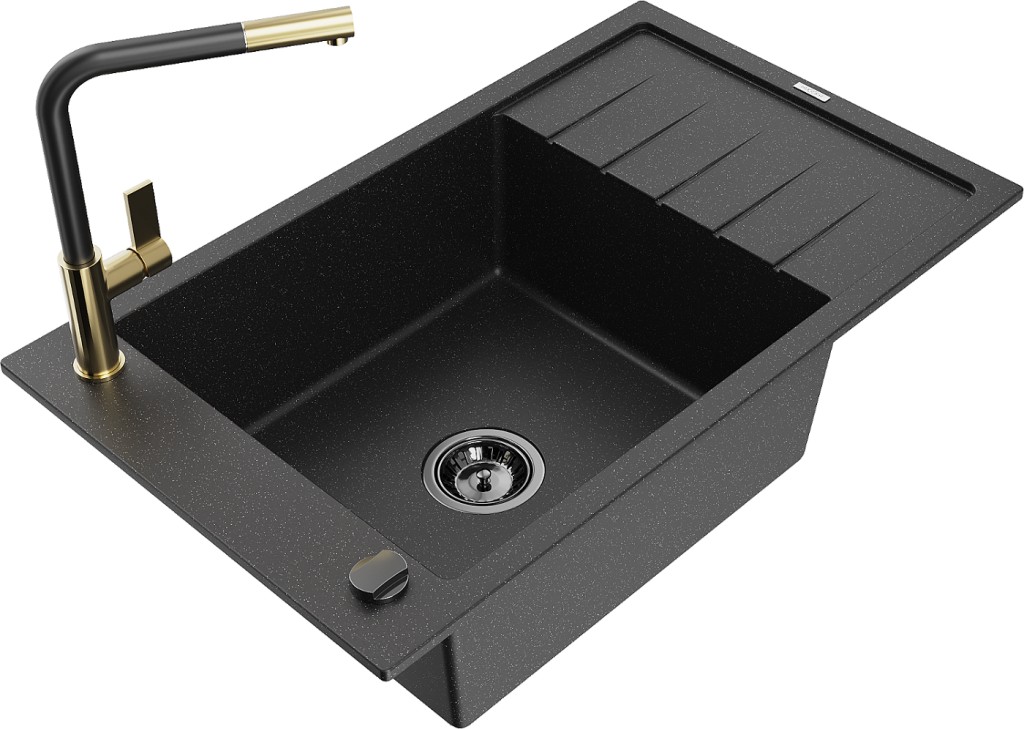 Technické dáta: drez: Rozmer: 795 x 480 x 200 mm Hĺbka komory: 190 mm Rozmery komory: 465x420 mm Priemer odtoku: ø90 mm Typ: 1-miska s krátkym odkvapkávačom Typ: Zapustené do pracovnej dosky Farba: čierna/strieborná metalíza Povrchová úprava sifónu: čierna Materiál: žula (80% žulové kamenivo, 20% živice) Prepadový otvor: Áno Otvory: (batérie, automatické) 2 Inštalácia: Univerzálna, je možné inštalovať s odkvapkávačom na ľavú alebo pravú stranu Vysoká odolnosť proti poškriabaniu a zmene farby Odolnosť proti tepelným šokom Ľahko čistiteľný povrch Jeden dodatočný vyfrézovaný otvor na samodierovanie ø35 kuchynská batéria: Materiál: mosadz Farba: Zlatá/Čierna Hlava: Keramická Prevzdušňovač: Áno Typ: Jedna páka Rozsah výtoku: 245 mm Výška batérie: 307 mm(GT) Ean: 5905315060211