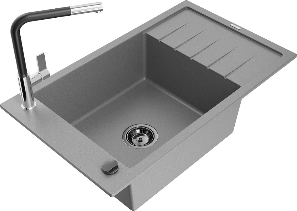 Technické dáta: drez: Rozmer: 795 x 480 x 200 mm Hĺbka komory: 190 mm Rozmery komory: 465x420 mm Priemer odtoku: ø90 mm Typ: 1-miska s krátkym odkvapkávačom Typ: Zapustené do pracovnej dosky Šedá farba Povrchová úprava sifónu: čierna Materiál: žula (80% žulové kamenivo, 20% živice) Prepadový otvor: Áno Otvory: (batérie, automatické) 2 Inštalácia: Univerzálna, je možné inštalovať s odkvapkávačom na ľavú alebo pravú stranu Vysoká odolnosť proti poškriabaniu a zmene farby Odolnosť proti tepelným šokom Ľahko čistiteľný povrch Jeden dodatočný vyfrézovaný otvor na samodierovanie ø35 kuchynská batéria: Materiál: mosadz Farba: chróm/čierna Hlava: Keramická Prevzdušňovač: Áno Typ: Jedna páka Rozsah výtoku: 245 mm Výška batérie: 307 mm(GT) Ean: 5905315060136