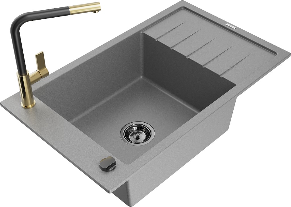 Technické dáta: drez: Rozmer: 795 x 480 x 200 mm Hĺbka komory: 190 mm Rozmery komory: 465x420 mm Priemer odtoku: ø90 mm Typ: 1-miska s krátkym odkvapkávačom Typ: Zapustené do pracovnej dosky Šedá farba Povrchová úprava sifónu: čierna Materiál: žula (80% žulové kamenivo, 20% živice) Prepadový otvor: Áno Otvory: (batérie, automatické) 2 Inštalácia: Univerzálna, je možné inštalovať s odkvapkávačom na ľavú alebo pravú stranu Vysoká odolnosť proti poškriabaniu a zmene farby Odolnosť proti tepelným šokom Ľahko čistiteľný povrch Jeden dodatočný vyfrézovaný otvor na samodierovanie ø35 kuchynská batéria: Materiál: mosadz Farba: Zlatá/Čierna Hlava: Keramická Prevzdušňovač: Áno Typ: Jedna páka Rozsah výtoku: 245 mm Výška batérie: 307 mm(GT) Ean: 5905315060150
