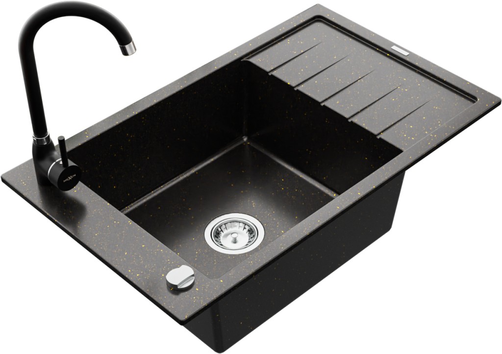 Technické dáta: drez: Rozmer: 795 x 480 x 200 mm Hĺbka komory: 190 mm Rozmery komory: 465x420 mm Priemer odtoku: ø90 mm Typ: 1-miska s krátkym odkvapkávačom Typ: Zapustené do pracovnej dosky Farba: čierna / zlatá metalíza Povrchová úprava sifónu: Chrome Materiál: žula (80% žulové kamenivo, 20% živice) Prepadový otvor: Áno Otvory: (batérie, automatické) 2 Inštalácia: Univerzálna, je možné inštalovať s odkvapkávačom na ľavú alebo pravú stranu Vysoká odolnosť proti poškriabaniu a zmene farby Odolnosť proti tepelným šokom Ľahko čistiteľný povrch Jeden dodatočný vyfrézovaný otvor na samodierovanie ø35 kuchynská batéria: Materiál: mosadz Čierna farba Hlava: Keramická Prevzdušňovač: Áno Výška batérie: 335 mm Rozsah výtoku: 180 mm(GT) Ean: 5907709160392