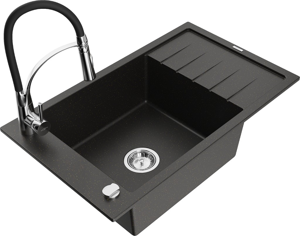 Technické dáta: drez: Rozmer: 795 x 480 x 200 mm Hĺbka komory: 190 mm Rozmery komory: 465x420 mm Priemer odtoku: ø90 mm Typ: 1-miska s krátkym odkvapkávačom Typ: Zapustené do pracovnej dosky Farba: čierna / zlatá metalíza Povrchová úprava sifónu: Chrome Materiál: žula (80% žulové kamenivo, 20% živice) Prepadový otvor: Áno Otvory: (batérie, automatické) 2 Inštalácia: Univerzálna, je možné inštalovať s odkvapkávačom na ľavú alebo pravú stranu Vysoká odolnosť proti poškriabaniu a zmene farby Odolnosť proti tepelným šokom Ľahko čistiteľný povrch Jeden dodatočný vyfrézovaný otvor na samodierovanie ø35 kuchynská batéria: Materiál: mosadz Farba: chróm/čierna Hlava: Keramická Prevzdušňovač: Áno Typ hubica: Flexibilný s mosadzným držiakom Typ: Jedna páka Výška batérie: 430 mm Rozsah výtoku: 235 mm(GT) Ean: 5905315046123