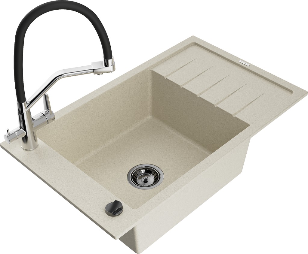 Technické dáta: Drez: Rozmer: 795x480x200 mm Hĺbka komory: 190 mm Rozmery komory: 465x420 mm Priemer odtoku: ø90 mm Typ: 1-miska s krátkym odkvapkávačom Typ: Zapustené do pracovnej dosky Farba béžová Povrchová úprava sifónu: čierna Materiál: žula (80% žulové kamenivo 20% živice) Prepadový otvor: Áno Otvory: (batérie, automat) 2 Inštalácia: Univerzálna, je možné inštalovať s odkvapkávačom na ľavú alebo pravú stranu Vysoká odolnosť proti poškriabaniu a zmene farby Odolnosť proti tepelným šokom Povrch pre ľahké čistenie Jeden dodatočný vyfrézovaný otvor na samodierovanie ø35 Kuchynská batéria: Materiál: mosadz Farba: chróm/čierna Hlavy: Keramické Perlátor: Áno Typ výtoku: Flexibilný s mosadznou podperou Rozsah výtoku: 260 mm Výška: 405 mm Typ: Dve rukoväte Dvojhlavá batéria s prídavným filtrom na pitnú vodu(GT) Ean: 5905315101235