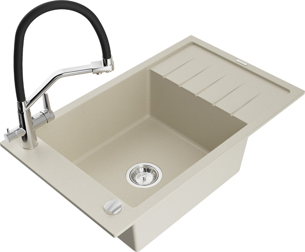 Technické dáta: Drez: Rozmer: 795x480x200 mm Hĺbka komory: 190 mm Rozmery komory: 465x420 mm Priemer odtoku: ø90 mm Typ: 1-miska s krátkym odkvapkávačom Typ: Zapustené do pracovnej dosky Farba béžová Povrchová úprava sifónu: Chrome Materiál: žula (80% žulové kamenivo 20% živice) Prepadový otvor: Áno Otvory: (batérie, automat) 2 Inštalácia: Univerzálna, je možné inštalovať s odkvapkávačom na ľavú alebo pravú stranu Vysoká odolnosť proti poškriabaniu a zmene farby Odolnosť proti tepelným šokom Povrch pre ľahké čistenie Jeden dodatočný vyfrézovaný otvor na samodierovanie ø35 Kuchynská batéria: Materiál: mosadz Farba: chróm/čierna Hlavy: Keramické Perlátor: Áno Typ výtoku: Flexibilný s mosadznou podperou Rozsah výtoku: 260 mm Výška: 405 mm Typ: Dve rukoväte Dvojhlavá batéria s prídavným filtrom na pitnú vodu(GT) Ean: 5905315101228