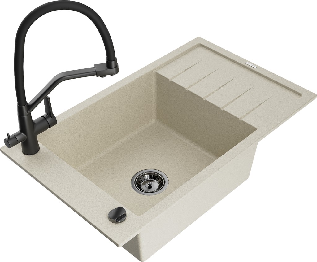 Technické dáta: Drez: Rozmer: 795x480x200 mm Hĺbka komory: 190 mm Rozmery komory: 465x420 mm Priemer odtoku: ø90 mm Typ: 1-miska s krátkym odkvapkávačom Typ: Zapustené do pracovnej dosky Farba béžová Povrchová úprava sifónu: čierna Materiál: žula (80% žulové kamenivo 20% živice) Prepadový otvor: Áno Otvory: (batérie, automat) 2 Inštalácia: Univerzálna, je možné inštalovať s odkvapkávačom na ľavú alebo pravú stranu Vysoká odolnosť proti poškriabaniu a zmene farby Odolnosť proti tepelným šokom Povrch pre ľahké čistenie Jeden dodatočný vyfrézovaný otvor na samodierovanie ø35 Kuchynská batéria: Materiál: mosadz Čierna farba Hlavy: Keramické Perlátor: Áno Typ výtoku: Flexibilný s mosadznou podperou Rozsah výtoku: 260 mm Výška: 405 mm Typ: Dve rukoväte Dvojhlavá batéria s prídavným filtrom na pitnú vodu (GT) Ean: 5905315101266