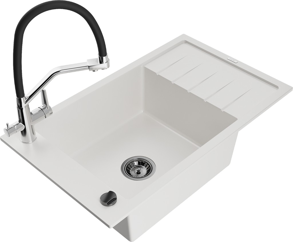 Technické dáta: drez: Rozmer: 795 x 480 x 200 mm Hĺbka komory: 190 mm Rozmery komory: 465x420 mm Priemer odtoku: ø90 mm Typ: 1-miska s krátkym odkvapkávačom Typ: Zapustené do pracovnej dosky biela farba Povrchová úprava sifónu: čierna Materiál: žula (80% žulové kamenivo, 20% živice) Prepadový otvor: Áno Otvory: (batérie, automatické) 2 Inštalácia: Univerzálna, je možné inštalovať s odkvapkávačom na ľavú alebo pravú stranu Vysoká odolnosť proti poškriabaniu a zmene farby Odolnosť proti tepelným šokom Ľahko čistiteľný povrch Jeden dodatočný vyfrézovaný otvor na samodierovanie ø35 kuchynská batéria: Materiál: mosadz Farba: chróm/čierna Hlavy: Keramické Prevzdušňovač: Áno Typ hubica: Flexibilný s mosadzným držiakom Rozsah výtoku: 260 mm Výška: 405 mm Typ: Dve rukoväte Dvojhlavá batéria s prídavným filtrom na pitnú vodu(GT) Ean: 5905315101181
