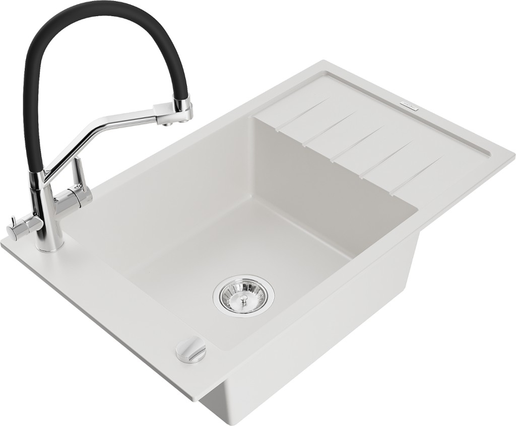 Technické dáta: drez: Rozmer: 795 x 480 x 200 mm Hĺbka komory: 190 mm Rozmery komory: 465x420 mm Priemer odtoku: ø90 mm Typ: 1-miska s krátkym odkvapkávačom Typ: Zapustené do pracovnej dosky biela farba Povrchová úprava sifónu: Chrome Materiál: žula (80% žulové kamenivo, 20% živice) Prepadový otvor: Áno Otvory: (batérie, automatické) 2 Inštalácia: Univerzálna, je možné inštalovať s odkvapkávačom na ľavú alebo pravú stranu Vysoká odolnosť proti poškriabaniu a zmene farby Odolnosť proti tepelným šokom Ľahko čistiteľný povrch Jeden dodatočný vyfrézovaný otvor na samodierovanie ø35 kuchynská batéria: Materiál: mosadz Farba: chróm/čierna Hlavy: Keramické Prevzdušňovač: Áno Typ hubica: Flexibilný s mosadzným držiakom Rozsah výtoku: 260 mm Výška: 405 mm Typ: Dve rukoväte Dvojhlavá batéria s prídavným filtrom na pitnú vodu(GT) Ean: 5905315101174