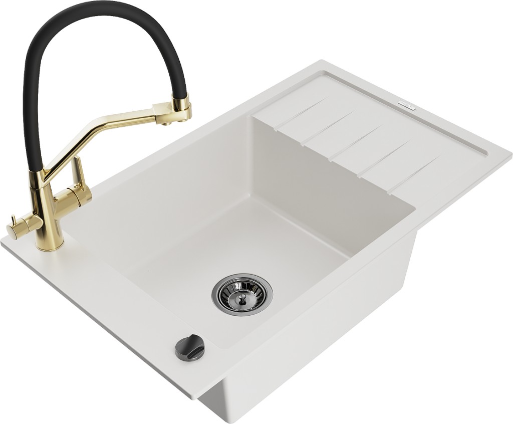 Technické dáta: drez: Rozmer: 795 x 480 x 200 mm Hĺbka komory: 190 mm Rozmery komory: 465x420 mm Priemer odtoku: ø90 mm Typ: 1-miska s krátkym odkvapkávačom Typ: Zapustené do pracovnej dosky biela farba Povrchová úprava sifónu: čierna Materiál: žula (80% žulové kamenivo, 20% živice) Prepadový otvor: Áno Otvory: (batérie, automatické) 2 Inštalácia: Univerzálna, je možné inštalovať s odkvapkávačom na ľavú alebo pravú stranu Vysoká odolnosť proti poškriabaniu a zmene farby Odolnosť proti tepelným šokom Ľahko čistiteľný povrch Jeden dodatočný vyfrézovaný otvor na samodierovanie ø35 kuchynská batéria: Materiál: mosadz Farba: Zlatá/Čierna Hlavy: Keramické Prevzdušňovač: Áno Typ hubica: Flexibilný s mosadzným držiakom Rozsah výtoku: 260 mm Výška: 405 mm Typ: Dve rukoväte Dvojhlavá batéria s prídavným filtrom na pitnú vodu(GT) Ean: 5905315101204
