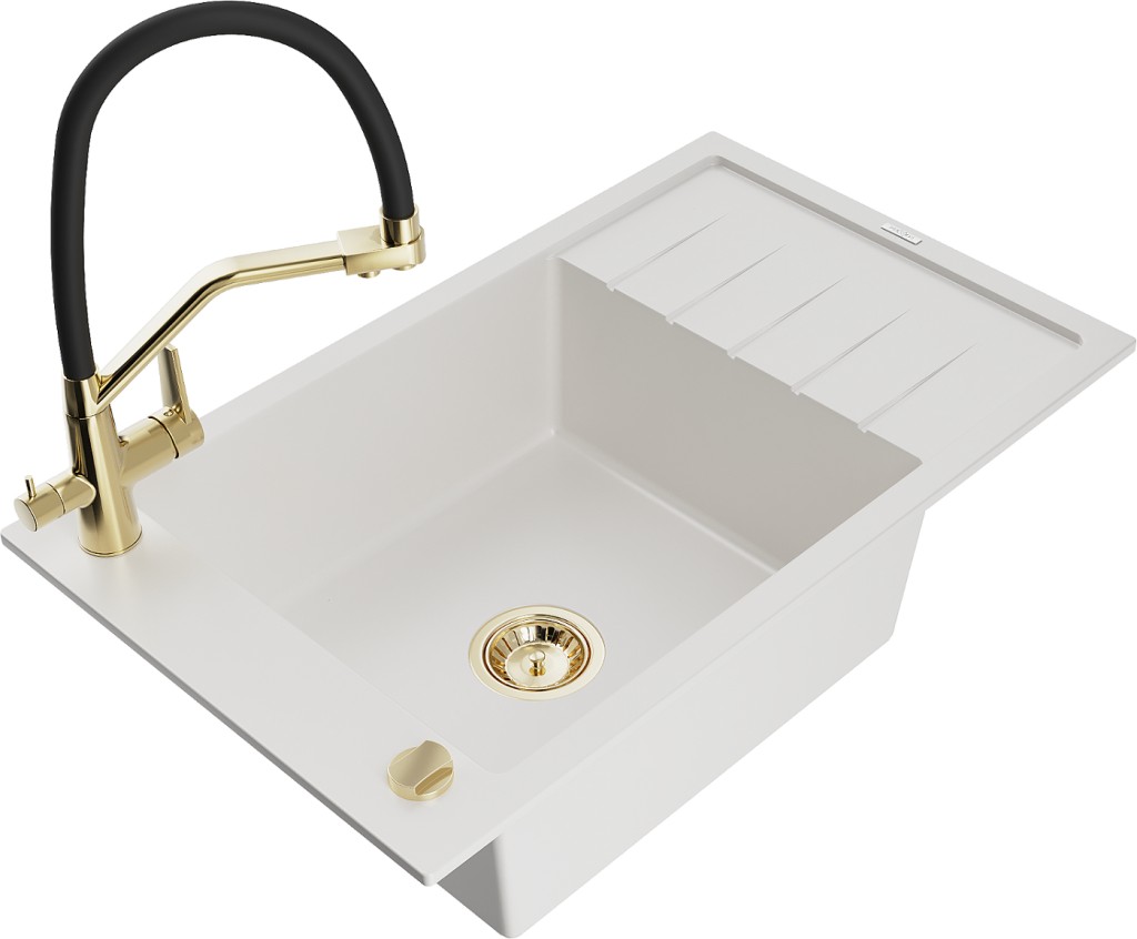 Technické dáta: drez: Rozmer: 795 x 480 x 200 mm Hĺbka komory: 190 mm Rozmery komory: 465x420 mm Priemer odtoku: ø90 mm Typ: 1-miska s krátkym odkvapkávačom Typ: Zapustené do pracovnej dosky biela farba Povrchová úprava sifónu: zlatá Materiál: žula (80% žulové kamenivo, 20% živice) Prepadový otvor: Áno Otvory: (batérie, automatické) 2 Inštalácia: Univerzálna, je možné inštalovať s odkvapkávačom na ľavú alebo pravú stranu Vysoká odolnosť proti poškriabaniu a zmene farby Odolnosť proti tepelným šokom Ľahko čistiteľný povrch Jeden dodatočný vyfrézovaný otvor na samodierovanie ø35 kuchynská batéria: Materiál: mosadz Farba: Zlatá/Čierna Hlavy: Keramické Prevzdušňovač: Áno Typ hubica: Flexibilný s mosadzným držiakom Rozsah výtoku: 260 mm Výška: 405 mm Typ: Dve rukoväte Dvojhlavá batéria s prídavným filtrom na pitnú vodu(GT) Ean: 5905315101198