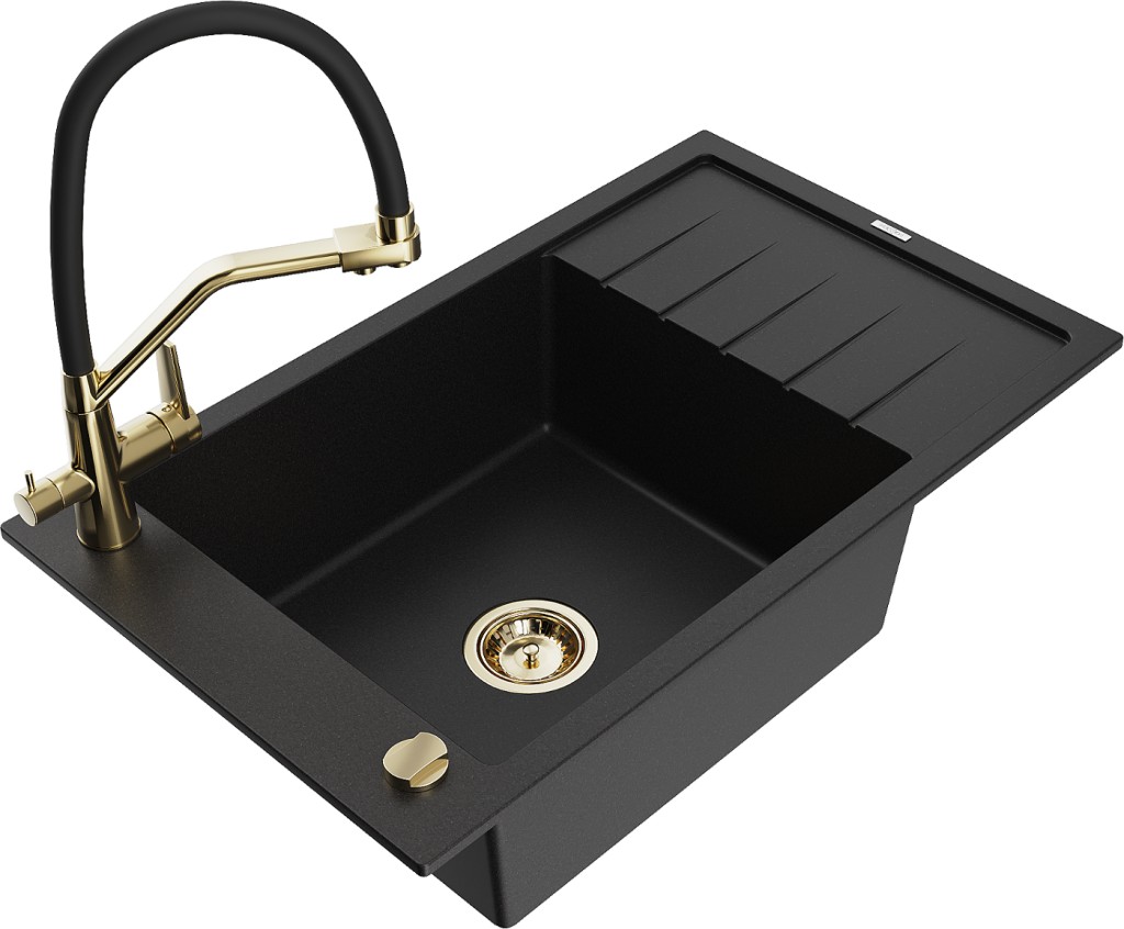 Technické dáta: drez: Rozmer: 795 x 480 x 200 mm Hĺbka komory: 190 mm Rozmery komory: 465x420 mm Priemer odtoku: ø90 mm Typ: 1-miska s krátkym odkvapkávačom Typ: Zapustené do pracovnej dosky Čierna farba Povrchová úprava sifónu: zlatá Materiál: žula (80% žulové kamenivo, 20% živice) Prepadový otvor: Áno Otvory: (batérie, automatické) 2 Inštalácia: Univerzálna, je možné inštalovať s odkvapkávačom na ľavú alebo pravú stranu Vysoká odolnosť proti poškriabaniu a zmene farby Odolnosť proti tepelným šokom Ľahko čistiteľný povrch Jeden dodatočný vyfrézovaný otvor na samodierovanie ø35 kuchynská batéria: Materiál: mosadz Farba: Zlatá/Čierna Hlavy: Keramické Prevzdušňovač: Áno Typ hubica: Flexibilný s mosadzným držiakom Rozsah výtoku: 260 mm Výška: 405 mm Typ: Dve rukoväte Dvojhlavá batéria s prídavným filtrom na pitnú vodu(GT) Ean: 5905315101495