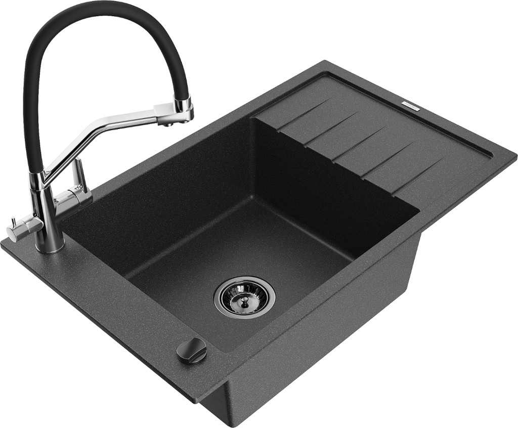 Technické dáta: drez: Rozmer: 795 x 480 x 200 mm Hĺbka komory: 190 mm Rozmery komory: 465x420 mm Priemer odtoku: ø90 mm Typ: 1-miska s krátkym odkvapkávačom Typ: Zapustené do pracovnej dosky Farba: Škvrnitá čierna Povrchová úprava sifónu: čierna Materiál: žula (80% žulové kamenivo, 20% živice) Prepadový otvor: Áno Otvory: (batérie, automatické) 2 Inštalácia: Univerzálna, je možné inštalovať s odkvapkávačom na ľavú alebo pravú stranu Vysoká odolnosť proti poškriabaniu a zmene farby Odolnosť proti tepelným šokom Ľahko čistiteľný povrch Jeden dodatočný vyfrézovaný otvor na samodierovanie ø35 kuchynská batéria: Materiál: mosadz Farba: chróm/čierna Hlavy: Keramické Prevzdušňovač: Áno Typ hubica: Flexibilný s mosadzným držiakom Rozsah výtoku: 260 mm Výška: 405 mm Typ: Dve rukoväte Dvojhlavá batéria s prídavným filtrom na pitnú vodu(GT) Ean: 5905315101433