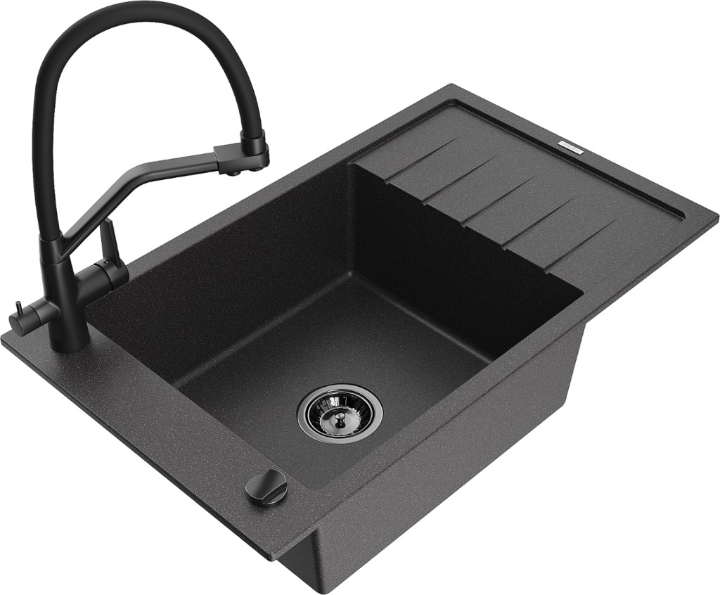 Technické dáta: drez: Rozmer: 795 x 480 x 200 mm Hĺbka komory: 190 mm Rozmery komory: 465x420 mm Priemer odtoku: ø90 mm Typ: 1-miska s krátkym odkvapkávačom Typ: Zapustené do pracovnej dosky Farba: Škvrnitá čierna Povrchová úprava sifónu: čierna Materiál: žula (80% žulové kamenivo, 20% živice) Prepadový otvor: Áno Otvory: (batérie, automatické) 2 Inštalácia: Univerzálna, je možné inštalovať s odkvapkávačom na ľavú alebo pravú stranu Vysoká odolnosť proti poškriabaniu a zmene farby Odolnosť proti tepelným šokom Ľahko čistiteľný povrch Jeden dodatočný vyfrézovaný otvor na samodierovanie ø35 kuchynská batéria: Materiál: mosadz Čierna farba Hlavy: Keramické Prevzdušňovač: Áno Typ hubica: Flexibilný s mosadzným držiakom Rozsah výtoku: 260 mm Výška: 405 mm Typ: Dve rukoväte Dvojhlavá batéria s prídavným filtrom na pitnú vodu(GT) Ean: 5905315101464