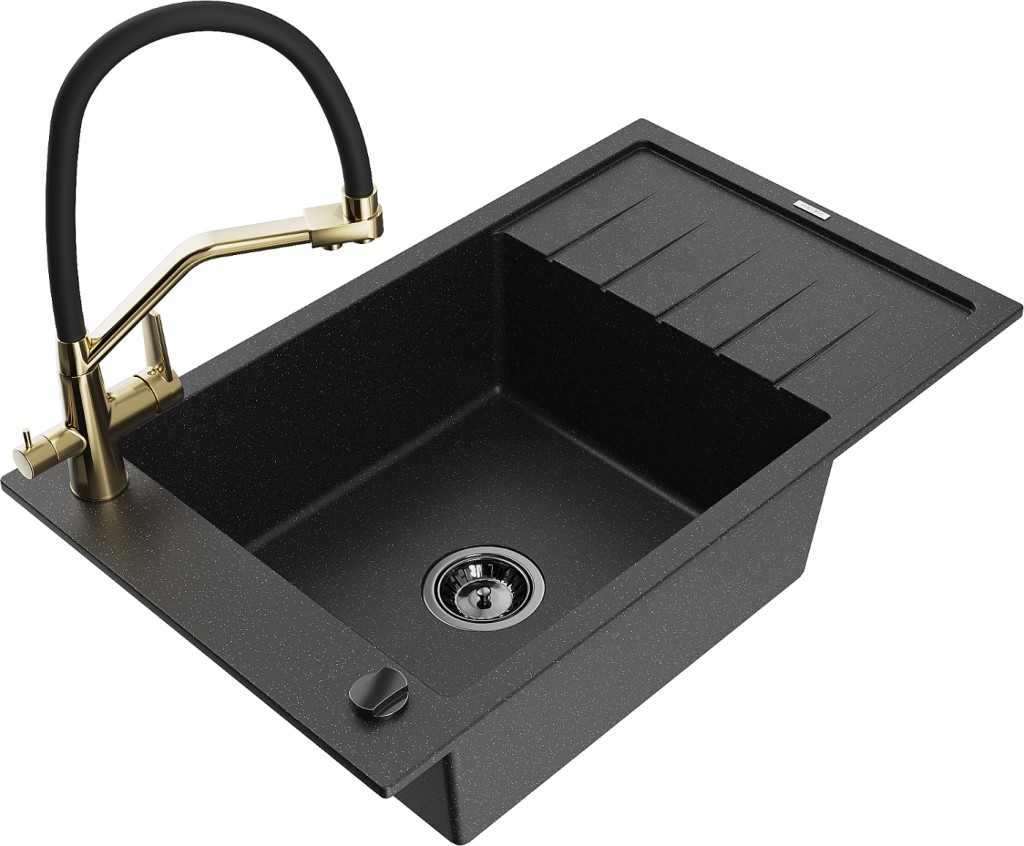 Technické dáta: drez: Rozmer: 795 x 480 x 200 mm Hĺbka komory: 190 mm Rozmery komory: 465x420 mm Priemer odtoku: ø90 mm Typ: 1-miska s krátkym odkvapkávačom Typ: Zapustené do pracovnej dosky Farba: čierna/strieborná metalíza Povrchová úprava sifónu: čierna Materiál: žula (80% žulové kamenivo, 20% živice) Prepadový otvor: Áno Otvory: (batérie, automatické) 2 Inštalácia: Univerzálna, je možné inštalovať s odkvapkávačom na ľavú alebo pravú stranu Vysoká odolnosť proti poškriabaniu a zmene farby Odolnosť proti tepelným šokom Ľahko čistiteľný povrch Jeden dodatočný vyfrézovaný otvor na samodierovanie ø35 kuchynská batéria: Materiál: mosadz Farba: Zlatá/Čierna Hlavy: Keramické Prevzdušňovač: Áno Typ hubica: Flexibilný s mosadzným držiakom Rozsah výtoku: 260 mm Výška: 405 mm Typ: Dve rukoväte Dvojhlavá batéria s prídavným filtrom na pitnú vodu(GT) Ean: 5905315101358
