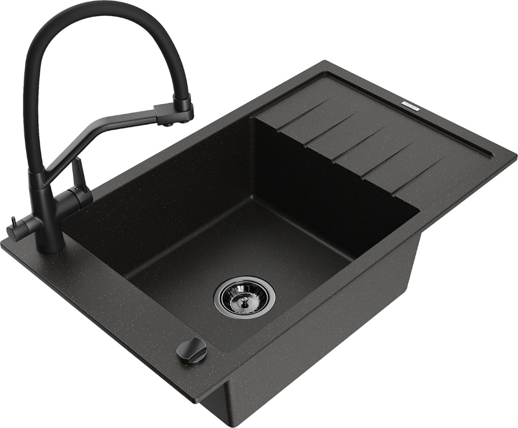 Technické dáta: drez: Rozmer: 795 x 480 x 200 mm Hĺbka komory: 190 mm Rozmery komory: 465x420 mm Priemer odtoku: ø90 mm Typ: 1-miska s krátkym odkvapkávačom Typ: Zapustené do pracovnej dosky Farba: čierna / zlatá metalíza Povrchová úprava sifónu: čierna Materiál: žula (80% žulové kamenivo, 20% živice) Prepadový otvor: Áno Otvory: (batérie, automatické) 2 Inštalácia: Univerzálna, je možné inštalovať s odkvapkávačom na ľavú alebo pravú stranu Vysoká odolnosť proti poškriabaniu a zmene farby Odolnosť proti tepelným šokom Ľahko čistiteľný povrch Jeden dodatočný vyfrézovaný otvor na samodierovanie ø35 kuchynská batéria: Materiál: mosadz Čierna farba Hlavy: Keramické Prevzdušňovač: Áno Typ hubica: Flexibilný s mosadzným držiakom Rozsah výtoku: 260 mm Výška: 405 mm Typ: Dve rukoväte Dvojhlavá batéria s prídavným filtrom na pitnú vodu(GT) Ean: 5905315101419