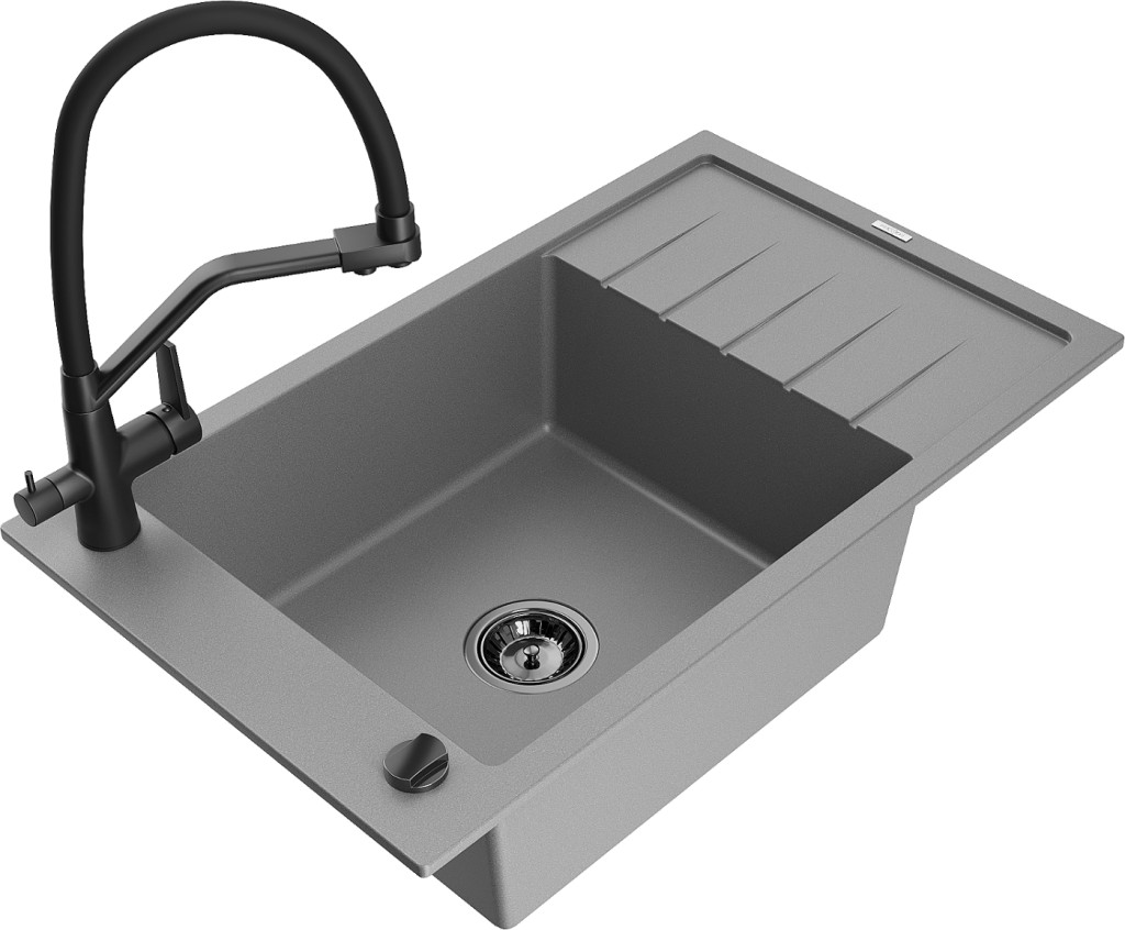 Technické dáta: drez: Rozmer: 795 x 480 x 200 mm Hĺbka komory: 190 mm Rozmery komory: 465x420 mm Priemer odtoku: ø90 mm Typ: 1-miska s krátkym odkvapkávačom Typ: Zapustené do pracovnej dosky Šedá farba Povrchová úprava sifónu: čierna Materiál: žula (80% žulové kamenivo, 20% živice) Prepadový otvor: Áno Otvory: (batérie, automatické) 2 Inštalácia: Univerzálna, je možné inštalovať s odkvapkávačom na ľavú alebo pravú stranu Vysoká odolnosť proti poškriabaniu a zmene farby Odolnosť proti tepelným šokom Ľahko čistiteľný povrch Jeden dodatočný vyfrézovaný otvor na samodierovanie ø35 kuchynská batéria: Materiál: mosadz Čierna farba Hlavy: Keramické Prevzdušňovač: Áno Typ hubica: Flexibilný s mosadzným držiakom Rozsah výtoku: 260 mm Výška: 405 mm Typ: Dve rukoväte Dvojhlavá batéria s prídavným filtrom na pitnú vodu(GT) Ean: 5905315101310