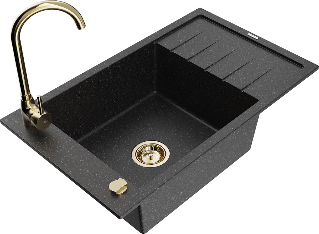 Technické dáta: drez: Rozmer: 795 x 480 x 200 mm Hĺbka komory: 190 mm Rozmery komory: 465x420 mm Priemer odtoku: ø90 mm Typ: 1-miska s krátkym odkvapkávačom Typ: Zapustené do pracovnej dosky Farba: čierna/strieborná metalíza Povrchová úprava sifónu: zlatá Materiál: žula (80% žulové kamenivo, 20% živice) Prepadový otvor: Áno Otvory: (batérie, automatické) 2 Inštalácia: Univerzálna, je možné inštalovať s odkvapkávačom na ľavú alebo pravú stranu Vysoká odolnosť proti poškriabaniu a zmene farby Odolnosť proti tepelným šokom Ľahko čistiteľný povrch Jeden dodatočný vyfrézovaný otvor na samodierovanie ø35 kuchynská batéria: Materiál: mosadz Farba: Zlatá Hlava: Keramická Prevzdušňovač: Áno Typ: Jedna páka Výška batérie: 335 mm Rozsah výtoku: 180 mm(GT) Ean: 5905315015150