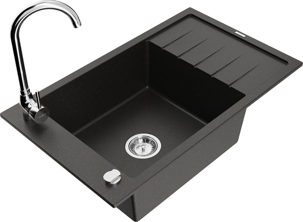 Technické dáta: drez: Rozmer: 795 x 480 x 200 mm Hĺbka komory: 190 mm Rozmery komory: 465x420 mm Priemer odtoku: ø90 mm Typ: 1-miska s krátkym odkvapkávačom Typ: Zapustené do pracovnej dosky Farba: čierna / zlatá metalíza Povrchová úprava sifónu: Chrome Materiál: žula (80% žulové kamenivo, 20% živice) Prepadový otvor: Áno Otvory: (batérie, automatické) 2 Inštalácia: Univerzálna, je možné inštalovať s odkvapkávačom na ľavú alebo pravú stranu Vysoká odolnosť proti poškriabaniu a zmene farby Odolnosť proti tepelným šokom Ľahko čistiteľný povrch Jeden dodatočný vyfrézovaný otvor na samodierovanie ø35 kuchynská batéria: Materiál: mosadz Farba: Chrome Hlava: Keramická Prevzdušňovač: Áno Typ: Jedna páka Výška batérie: 335 mm Rozsah výtoku: 180 mm(GT) Ean: 5905315015174