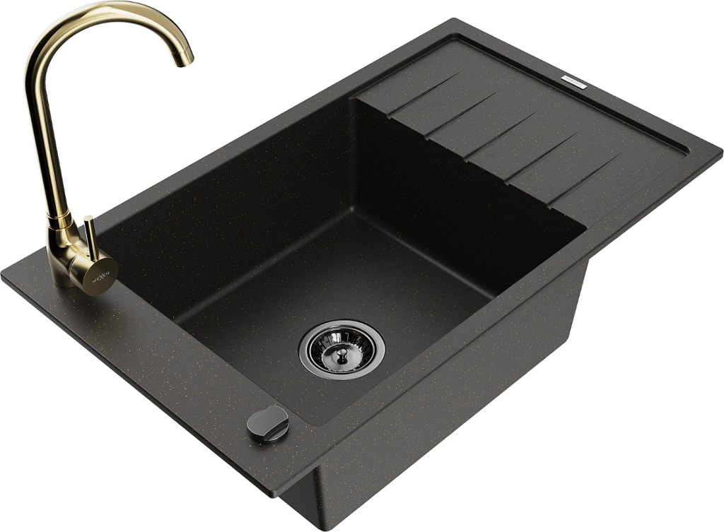 Technické dáta: drez: Rozmer: 795 x 480 x 200 mm Hĺbka komory: 190 mm Rozmery komory: 465x420 mm Priemer odtoku: ø90 mm Typ: 1-miska s krátkym odkvapkávačom Typ: Zapustené do pracovnej dosky Farba: čierna / zlatá metalíza Povrchová úprava sifónu: čierna Materiál: žula (80% žulové kamenivo, 20% živice) Prepadový otvor: Áno Otvory: (batérie, automatické) 2 Inštalácia: Univerzálna, je možné inštalovať s odkvapkávačom na ľavú alebo pravú stranu Vysoká odolnosť proti poškriabaniu a zmene farby Odolnosť proti tepelným šokom Ľahko čistiteľný povrch Jeden dodatočný vyfrézovaný otvor na samodierovanie ø35 kuchynská batéria: Materiál: mosadz Farba: Zlatá Hlava: Keramická Prevzdušňovač: Áno Typ: Jedna páka Výška batérie: 335 mm Rozsah výtoku: 180 mm(GT) Ean: 5905315015181