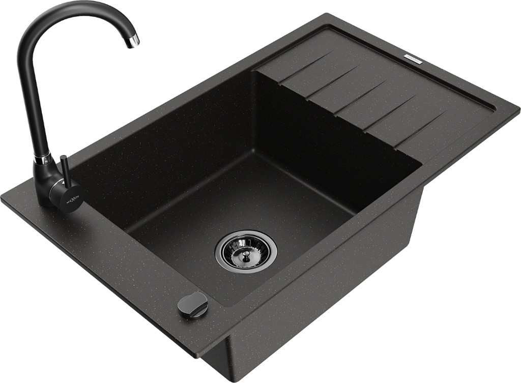 Technické dáta: drez: Rozmer: 795 x 480 x 200 mm Hĺbka komory: 190 mm Rozmery komory: 465x420 mm Priemer odtoku: ø90 mm Typ: 1-miska s krátkym odkvapkávačom Typ: Zapustené do pracovnej dosky Farba: čierna / zlatá metalíza Povrchová úprava sifónu: čierna Materiál: žula (80% žulové kamenivo, 20% živice) Prepadový otvor: Áno Otvory: (batérie, automatické) 2 Inštalácia: Univerzálna, je možné inštalovať s odkvapkávačom na ľavú alebo pravú stranu Vysoká odolnosť proti poškriabaniu a zmene farby Odolnosť proti tepelným šokom Ľahko čistiteľný povrch Jeden dodatočný vyfrézovaný otvor na samodierovanie ø35 kuchynská batéria: Materiál: mosadz Čierna farba Hlava: Keramická Prevzdušňovač: Áno Typ: Jedna páka Výška batérie: 335 mm Rozsah výtoku: 180 mm(GT) Ean: 5905315015198