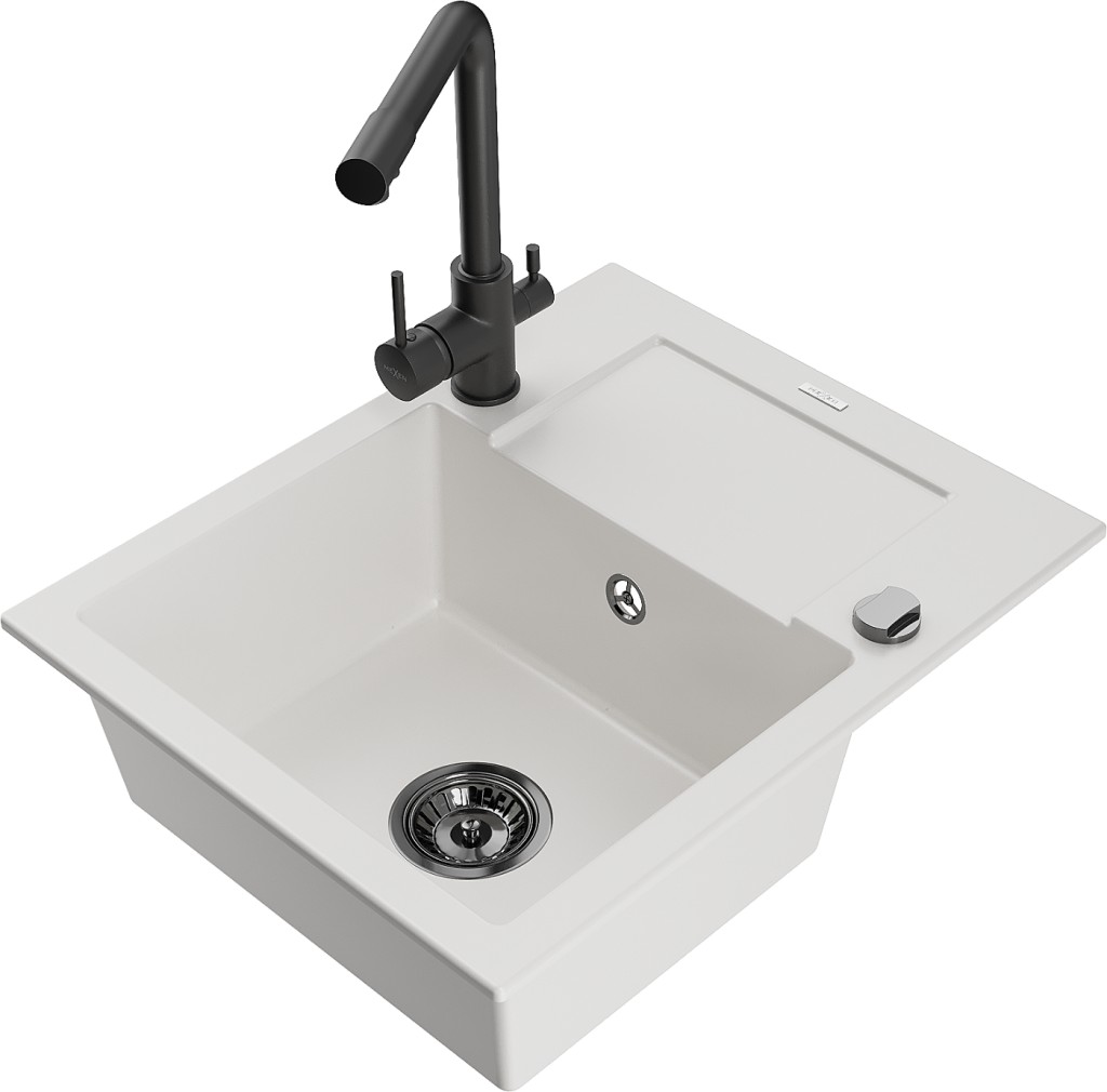 Technické dáta: drez: Rozmer: 576x465x174mm Hĺbka komory: 164 mm Rozmery komory: 395x320 mm Priemer odtoku: ø90 mm Typ: 1-miska s krátkym odkvapkávačom Typ: Zapustené do pracovnej dosky biela farba Povrchová úprava sifónu: čierna Materiál: žula (80% žulové kamenivo, 20% živice) Prepadový otvor: Áno Otvory: (batérie, automatické) 2 Inštalácia: Univerzálna, je možné inštalovať s odkvapkávačom na ľavú alebo pravú stranu Vysoká odolnosť proti poškriabaniu a zmene farby Odolnosť proti tepelným šokom Ľahko čistiteľný povrch Dva dodatočné vyfrézované otvory na samodierovanie ø35 kuchynská batéria: Materiál: mosadz Čierna farba Hlava: Keramická Prevzdušňovač: Áno Typ: Dve rukoväte Rozsah výtoku: 235 mm Výška batérie: 315 mm Dvojhlavá batéria s prídavným kanálom pre filtrovanú pitnú vodu(GT) Ean: 5905315023643