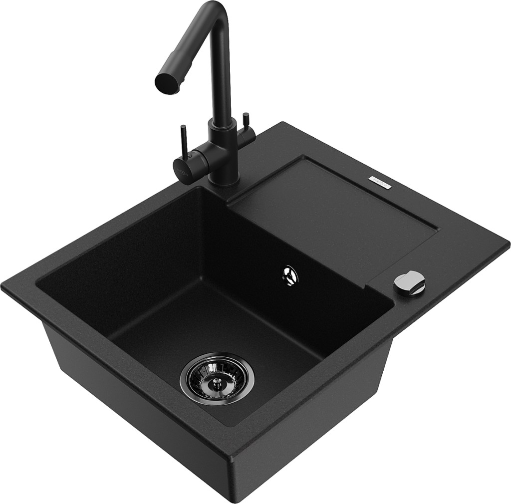 Technické dáta: drez: Rozmer: 576x465x174mm Hĺbka komory: 164 mm Rozmery komory: 395x320 mm Priemer odtoku: ø90 mm Typ: 1-miska s krátkym odkvapkávačom Typ: Zapustené do pracovnej dosky Čierna farba Povrchová úprava sifónu: čierna Materiál: žula (80% žulové kamenivo, 20% živice) Prepadový otvor: Áno Otvory: (batérie, automatické) 2 Inštalácia: Univerzálna, je možné inštalovať s odkvapkávačom na ľavú alebo pravú stranu Vysoká odolnosť proti poškriabaniu a zmene farby Odolnosť proti tepelným šokom Ľahko čistiteľný povrch Dva dodatočné vyfrézované otvory na samodierovanie ø35 kuchynská batéria: Materiál: mosadz Čierna farba Hlava: Keramická Prevzdušňovač: Áno Typ: Dve rukoväte Rozsah výtoku: 235 mm Výška batérie: 315 mm Dvojhlavá batéria s prídavným kanálom pre filtrovanú pitnú vodu(GT) Ean: 5905315023919