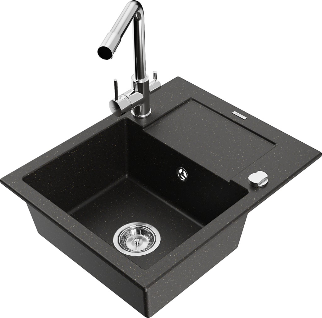 Technické dáta: drez: Rozmer: 576x465x174mm Hĺbka komory: 164 mm Rozmery komory: 395x320 mm Priemer odtoku: ø90 mm Typ: 1-miska s krátkym odkvapkávačom Typ: Zapustené do pracovnej dosky Farba: čierna / zlatá metalíza Povrchová úprava sifónu: Chrome Materiál: žula (80% žulové kamenivo, 20% živice) Prepadový otvor: Áno Otvory: (batérie, automatické) 2 Inštalácia: Univerzálna, je možné inštalovať s odkvapkávačom na ľavú alebo pravú stranu Vysoká odolnosť proti poškriabaniu a zmene farby Odolnosť proti tepelným šokom Ľahko čistiteľný povrch Dva dodatočné vyfrézované otvory na samodierovanie ø35 kuchynská batéria: Materiál: mosadz Farba: Chrome Hlava: Keramická Prevzdušňovač: Áno Typ: Dve rukoväte Rozsah výtoku: 235 mm Výška batérie: 315 mm Dvojhlavá batéria s prídavným kanálom pre filtrovanú pitnú vodu(GT) Ean: 5905315023780