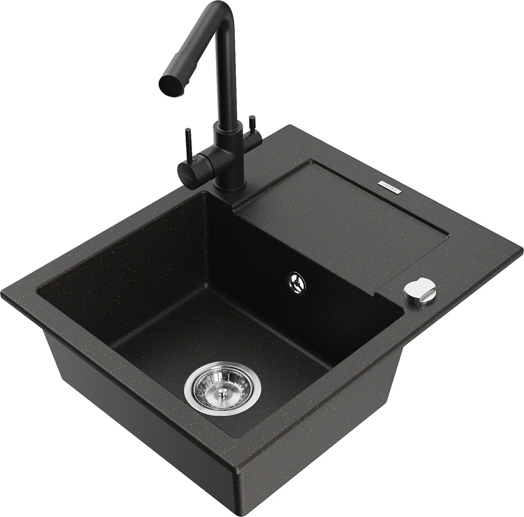Technické dáta: drez: Rozmer: 576x465x174mm Hĺbka komory: 164 mm Rozmery komory: 395x320 mm Priemer odtoku: ø90 mm Typ: 1-miska s krátkym odkvapkávačom Typ: Zapustené do pracovnej dosky Farba: čierna / zlatá metalíza Povrchová úprava sifónu: Chrome Materiál: žula (80% žulové kamenivo, 20% živice) Prepadový otvor: Áno Otvory: (batérie, automatické) 2 Inštalácia: Univerzálna, je možné inštalovať s odkvapkávačom na ľavú alebo pravú stranu Vysoká odolnosť proti poškriabaniu a zmene farby Odolnosť proti tepelným šokom Ľahko čistiteľný povrch Dva dodatočné vyfrézované otvory na samodierovanie ø35 kuchynská batéria: Materiál: mosadz Čierna farba Hlava: Keramická Prevzdušňovač: Áno Typ: Dve rukoväte Rozsah výtoku: 235 mm Výška batérie: 315 mm Dvojhlavá batéria s prídavným kanálom pre filtrovanú pitnú vodu(GT) Ean: 5905315023827