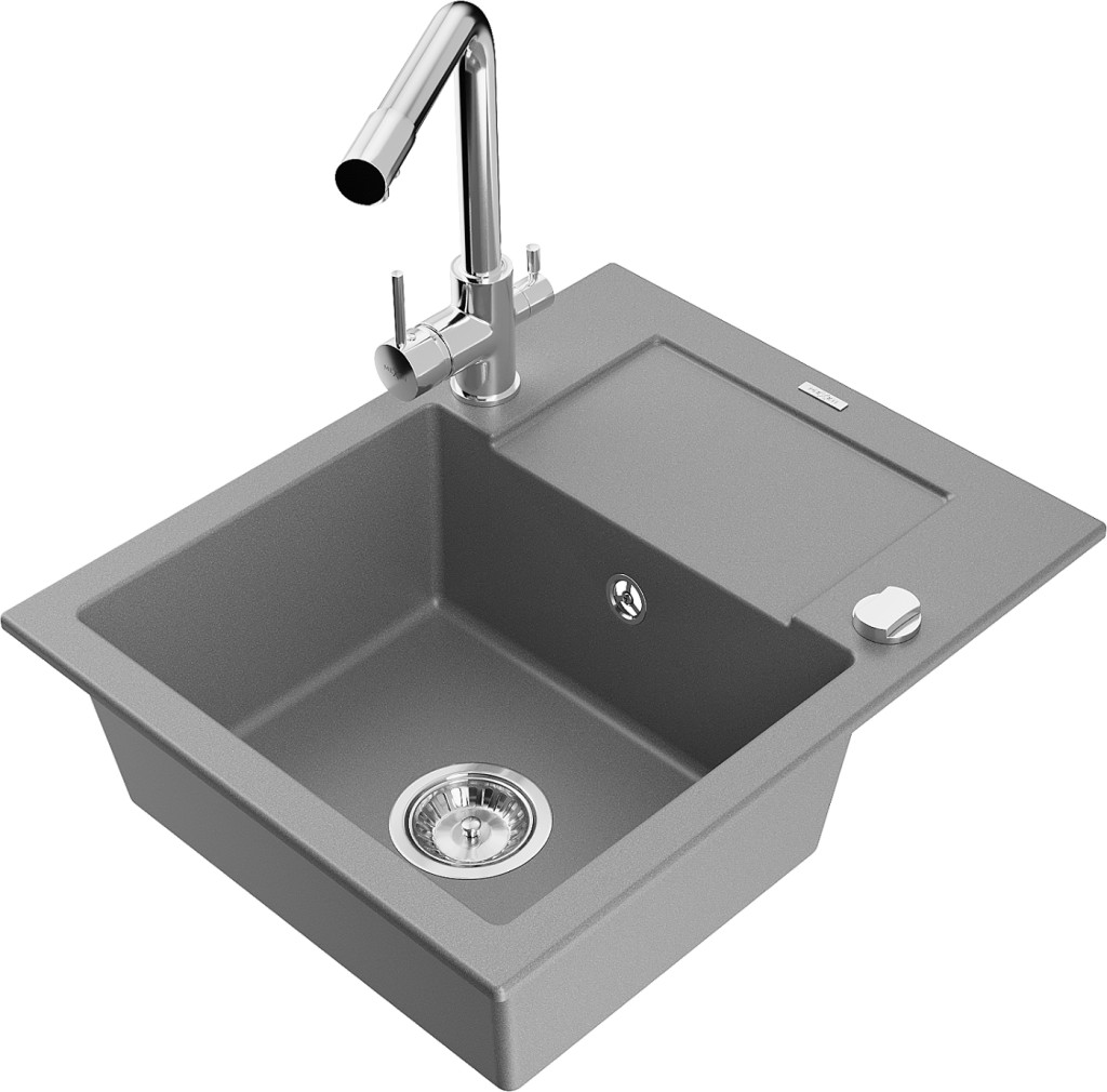 Technické dáta: drez: Rozmer: 576x465x174mm Hĺbka komory: 164 mm Rozmery komory: 395x320 mm Priemer odtoku: ø90 mm Typ: 1-miska s krátkym odkvapkávačom Typ: Zapustené do pracovnej dosky Šedá farba Povrchová úprava sifónu: Chrome Materiál: žula (80% žulové kamenivo, 20% živice) Prepadový otvor: Áno Otvory: (batérie, automatické) 2 Inštalácia: Univerzálna, je možné inštalovať s odkvapkávačom na ľavú alebo pravú stranu Vysoká odolnosť proti poškriabaniu a zmene farby Odolnosť proti tepelným šokom Ľahko čistiteľný povrch Dva dodatočné vyfrézované otvory na samodierovanie ø35 kuchynská batéria: Materiál: mosadz Farba: Chrome Hlava: Keramická Prevzdušňovač: Áno Typ: Dve rukoväte Rozsah výtoku: 235 mm Výška batérie: 315 mm Dvojhlavá batéria s prídavným kanálom pre filtrovanú pitnú vodu(GT) Ean: 5905315023698