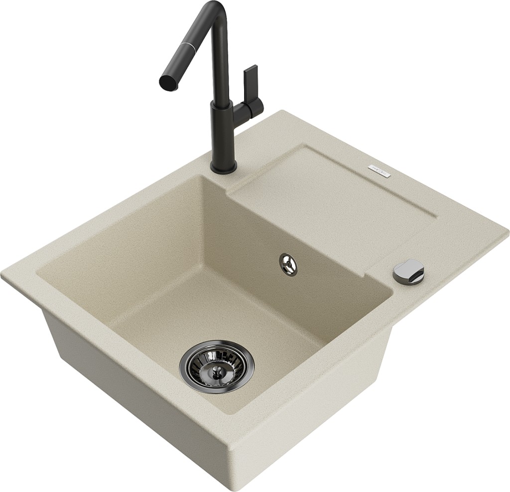 Technické dáta: drez: Rozmer: 576x465x174mm Hĺbka komory: 164 mm Rozmery komory: 395x320 mm Priemer odtoku: ø90 mm Typ: 1-miska s krátkym odkvapkávačom Typ: Zapustené do pracovnej dosky Farba béžová Povrchová úprava sifónu: čierna Materiál: žula (80% žulové kamenivo, 20% živice) Prepadový otvor: Áno Otvory: (batérie, automatické) 2 Inštalácia: Univerzálna, je možné inštalovať s odkvapkávačom na ľavú alebo pravú stranu Vysoká odolnosť proti poškriabaniu a zmene farby Odolnosť proti tepelným šokom Ľahko čistiteľný povrch Dva dodatočné vyfrézované otvory na samodierovanie ø35 kuchynská batéria: Materiál: mosadz Čierna farba Hlava: Keramická Prevzdušňovač: Áno Typ: Jedna páka Rozsah výtoku: 245 mm Výška batérie: 307 mm(GT) Ean: 5905315058591