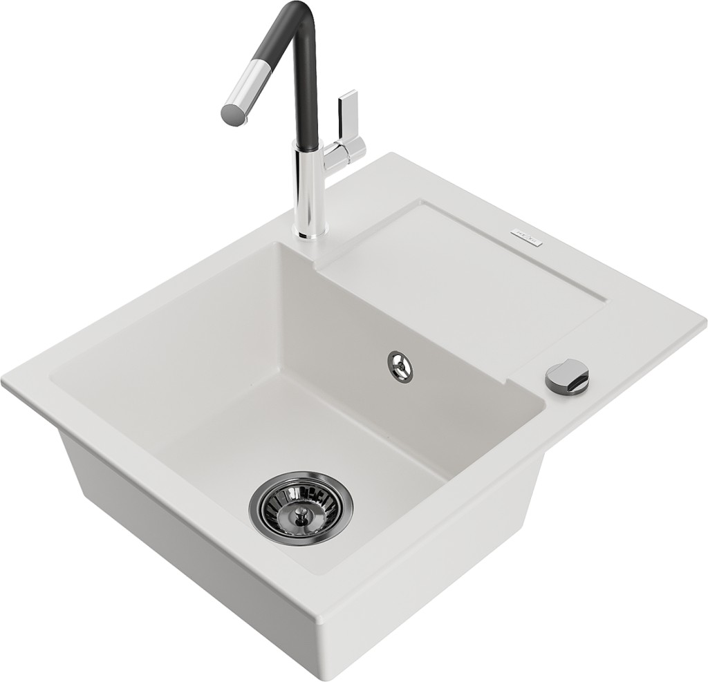 Technické dáta: drez: Rozmer: 576x465x174mm Hĺbka komory: 164 mm Rozmery komory: 395x320 mm Priemer odtoku: ø90 mm Typ: 1-miska s krátkym odkvapkávačom Typ: Zapustené do pracovnej dosky biela farba Povrchová úprava sifónu: čierna Materiál: žula (80% žulové kamenivo, 20% živice) Prepadový otvor: Áno Otvory: (batérie, automatické) 2 Inštalácia: Univerzálna, je možné inštalovať s odkvapkávačom na ľavú alebo pravú stranu Vysoká odolnosť proti poškriabaniu a zmene farby Odolnosť proti tepelným šokom Ľahko čistiteľný povrch Dva dodatočné vyfrézované otvory na samodierovanie ø35 kuchynská batéria: Materiál: mosadz Farba: chróm/čierna Hlava: Keramická Prevzdušňovač: Áno Typ: Jedna páka Rozsah výtoku: 245 mm Výška batérie: 307 mm(GT) Ean: 5905315058492