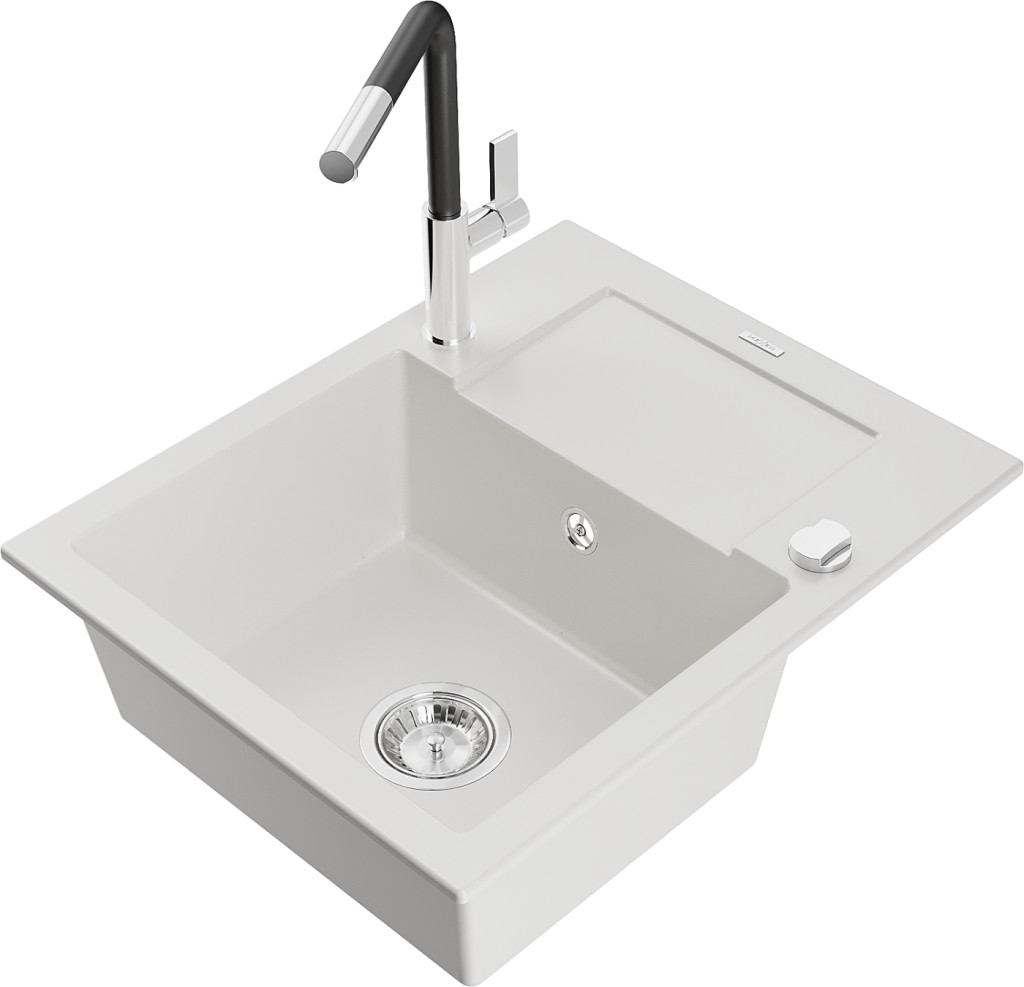 Technické dáta: drez: Rozmer: 576x465x174mm Hĺbka komory: 164 mm Rozmery komory: 395x320 mm Priemer odtoku: ø90 mm Typ: 1-miska s krátkym odkvapkávačom Typ: Zapustené do pracovnej dosky biela farba Povrchová úprava sifónu: Chrome Materiál: žula (80% žulové kamenivo, 20% živice) Prepadový otvor: Áno Otvory: (batérie, automatické) 2 Inštalácia: Univerzálna, je možné inštalovať s odkvapkávačom na ľavú alebo pravú stranu Vysoká odolnosť proti poškriabaniu a zmene farby Odolnosť proti tepelným šokom Ľahko čistiteľný povrch Dva dodatočné vyfrézované otvory na samodierovanie ø35 kuchynská batéria: Materiál: mosadz Farba: chróm/čierna Hlava: Keramická Prevzdušňovač: Áno Typ: Jedna páka Rozsah výtoku: 245 mm Výška batérie: 307 mm(GT) Ean: 5905315058485