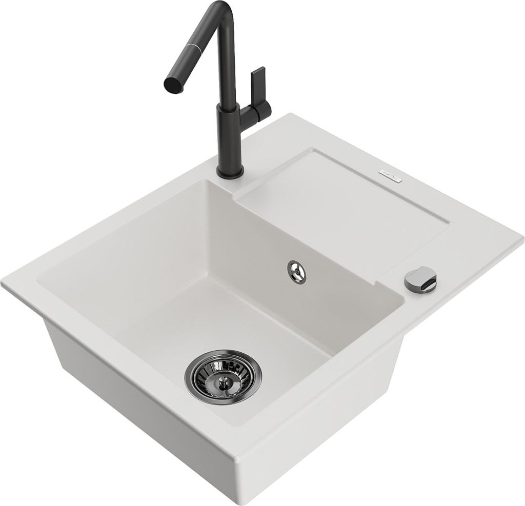 Technické dáta: drez: Rozmer: 576x465x174mm Hĺbka komory: 164 mm Rozmery komory: 395x320 mm Priemer odtoku: ø90 mm Typ: 1-miska s krátkym odkvapkávačom Typ: Zapustené do pracovnej dosky biela farba Povrchová úprava sifónu: čierna Materiál: žula (80% žulové kamenivo, 20% živice) Prepadový otvor: Áno Otvory: (batérie, automatické) 2 Inštalácia: Univerzálna, je možné inštalovať s odkvapkávačom na ľavú alebo pravú stranu Vysoká odolnosť proti poškriabaniu a zmene farby Odolnosť proti tepelným šokom Ľahko čistiteľný povrch Dva dodatočné vyfrézované otvory na samodierovanie ø35 kuchynská batéria: Materiál: mosadz Čierna farba Hlava: Keramická Prevzdušňovač: Áno Typ: Jedna páka Rozsah výtoku: 245 mm Výška batérie: 307 mm(GT) Ean: 5905315058522