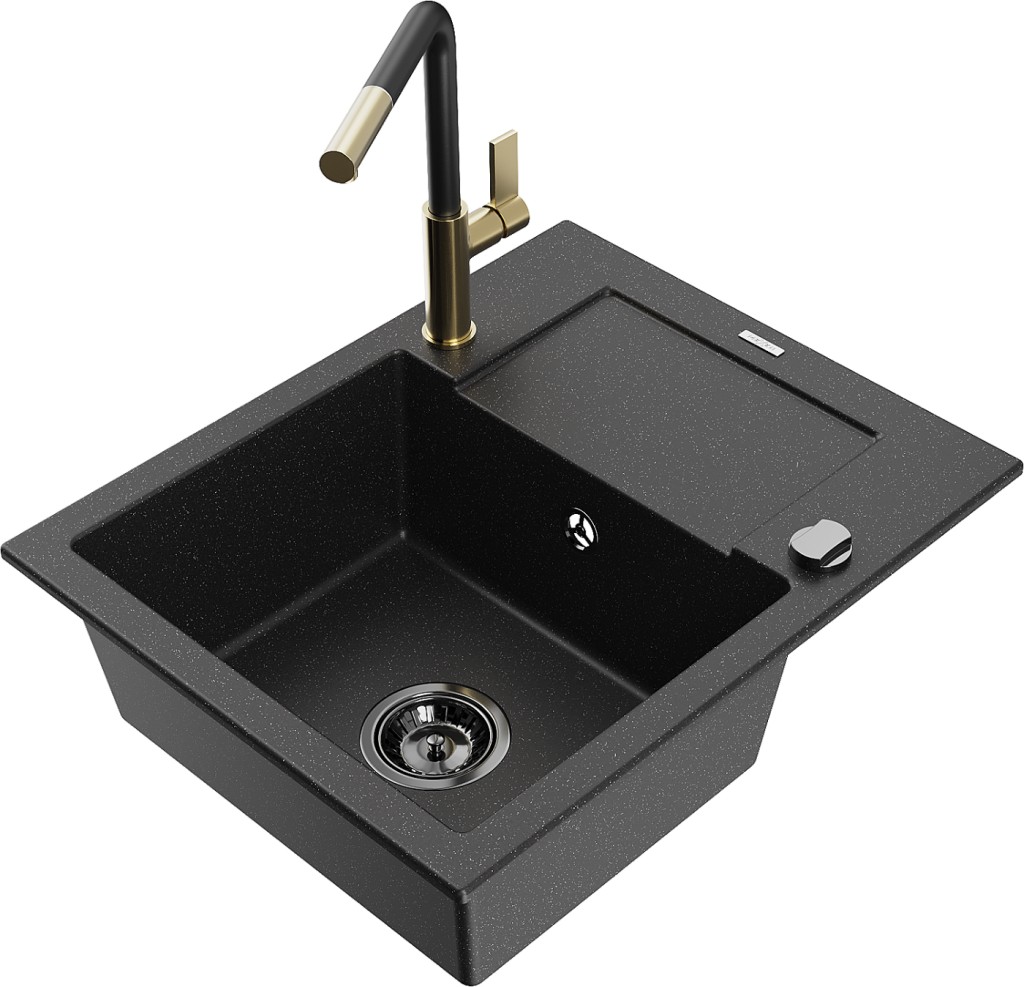 Technické dáta: drez: Rozmer: 576x465x174mm Hĺbka komory: 164 mm Rozmery komory: 395x320 mm Priemer odtoku: ø90 mm Typ: 1-miska s krátkym odkvapkávačom Typ: Zapustené do pracovnej dosky Farba: čierna/strieborná metalíza Povrchová úprava sifónu: čierna Materiál: žula (80% žulové kamenivo, 20% živice) Prepadový otvor: Áno Otvory: (batérie, automatické) 2 Inštalácia: Univerzálna, je možné inštalovať s odkvapkávačom na ľavú alebo pravú stranu Vysoká odolnosť proti poškriabaniu a zmene farby Odolnosť proti tepelným šokom Ľahko čistiteľný povrch Dva dodatočné vyfrézované otvory na samodierovanie ø35 kuchynská batéria: Materiál: mosadz Farba: Zlatá/Čierna Hlava: Keramická Prevzdušňovač: Áno Typ: Jedna páka Rozsah výtoku: 245 mm Výška batérie: 307 mm(GT) Ean: 5905315058713