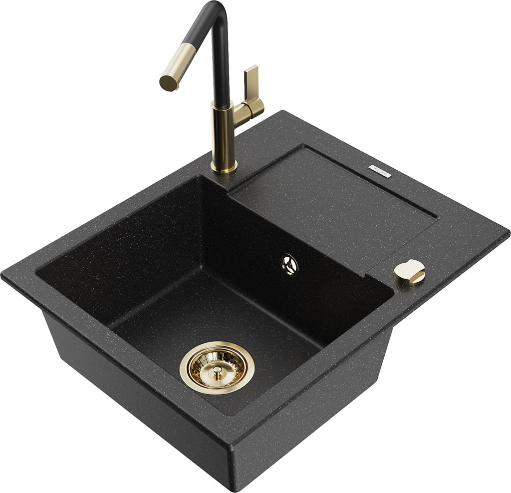Technické dáta: drez: Rozmer: 576x465x174mm Hĺbka komory: 164 mm Rozmery komory: 395x320 mm Priemer odtoku: ø90 mm Typ: 1-miska s krátkym odkvapkávačom Typ: Zapustené do pracovnej dosky Farba: čierna/strieborná metalíza Povrchová úprava sifónu: zlatá Materiál: žula (80% žulové kamenivo, 20% živice) Prepadový otvor: Áno Otvory: (batérie, automatické) 2 Inštalácia: Univerzálna, je možné inštalovať s odkvapkávačom na ľavú alebo pravú stranu Vysoká odolnosť proti poškriabaniu a zmene farby Odolnosť proti tepelným šokom Ľahko čistiteľný povrch Dva dodatočné vyfrézované otvory na samodierovanie ø35 kuchynská batéria: Materiál: mosadz Farba: Zlatá/Čierna Hlava: Keramická Prevzdušňovač: Áno Typ: Jedna páka Rozsah výtoku: 245 mm Výška batérie: 307 mm(GT) Ean: 5905315058706
