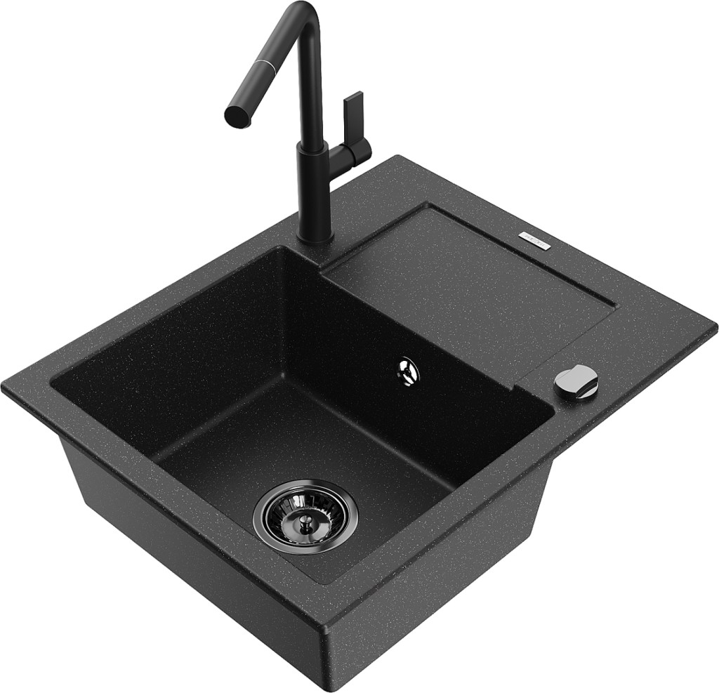 Technické dáta: drez: Rozmer: 576x465x174mm Hĺbka komory: 164 mm Rozmery komory: 395x320 mm Priemer odtoku: ø90 mm Typ: 1-miska s krátkym odkvapkávačom Typ: Zapustené do pracovnej dosky Farba: čierna/strieborná metalíza Povrchová úprava sifónu: čierna Materiál: žula (80% žulové kamenivo, 20% živice) Prepadový otvor: Áno Otvory: (batérie, automatické) 2 Inštalácia: Univerzálna, je možné inštalovať s odkvapkávačom na ľavú alebo pravú stranu Vysoká odolnosť proti poškriabaniu a zmene farby Odolnosť proti tepelným šokom Ľahko čistiteľný povrch Dva dodatočné vyfrézované otvory na samodierovanie ø35 kuchynská batéria: Materiál: mosadz Čierna farba Hlava: Keramická Prevzdušňovač: Áno Typ: Jedna páka Rozsah výtoku: 245 mm Výška batérie: 307 mm(GT) Ean: 5905315058720